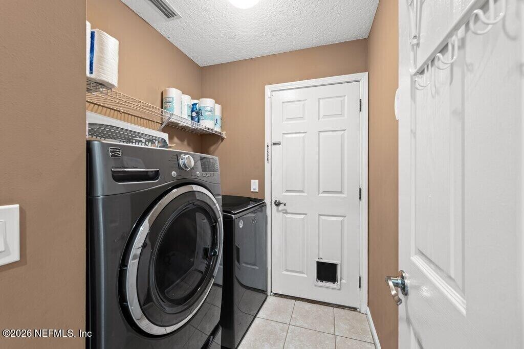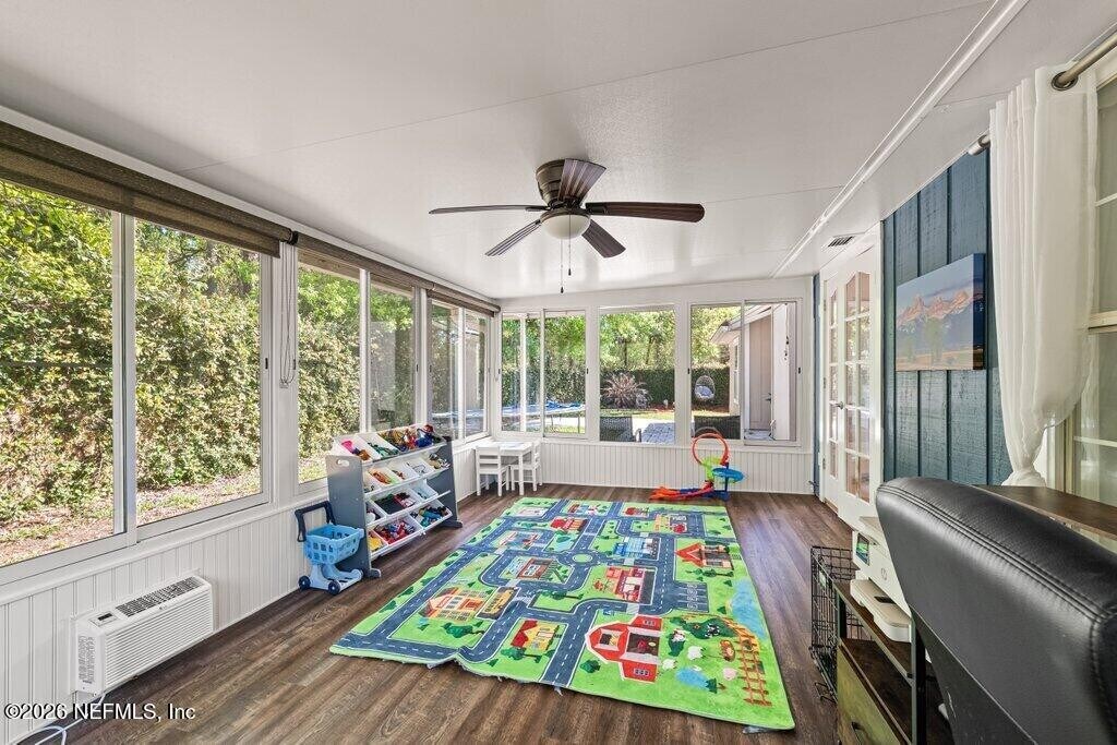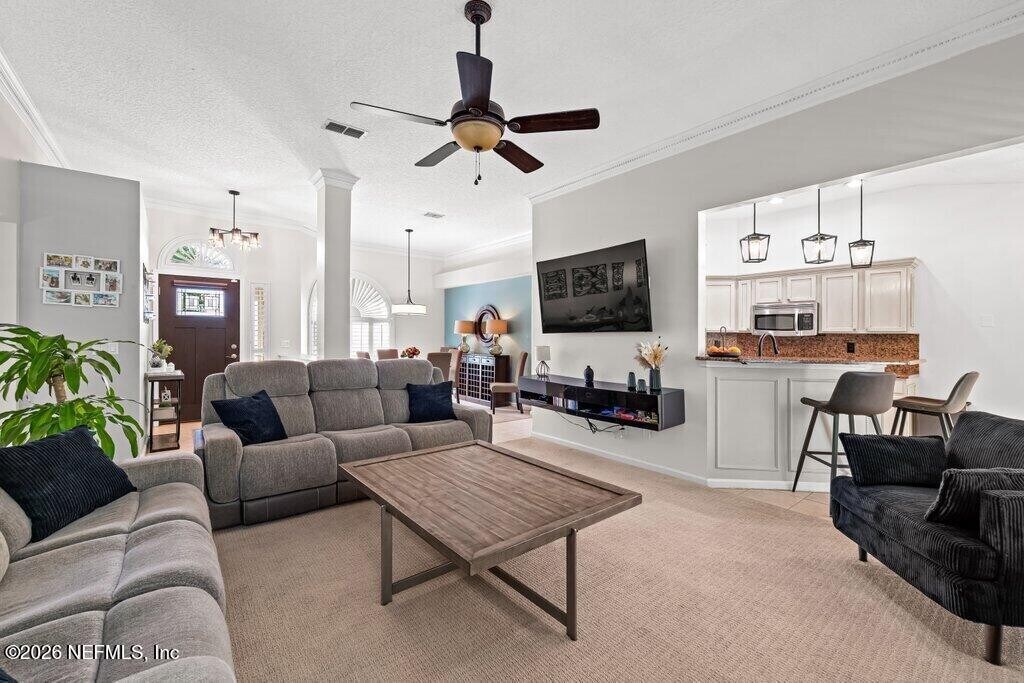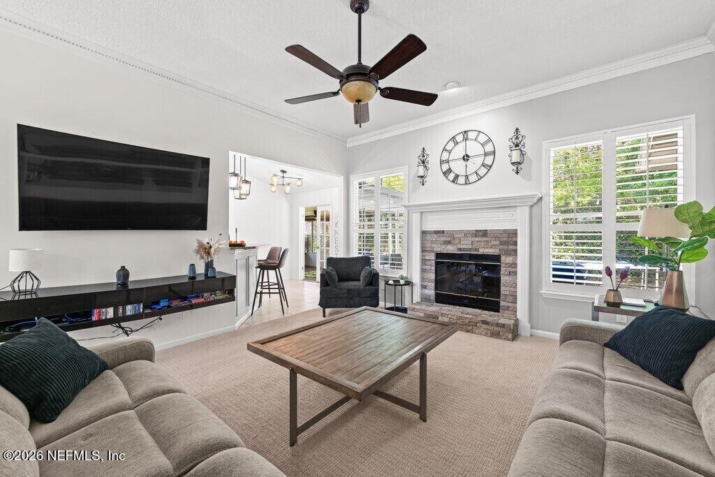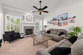 Tucked inside a gated community of Pace Island,this beautifully maintained 3-bedroom,2-bath home offers the perfect blend of comfort,privacy,and lifestyle. Residents enjoy 24-hour manned security along with amenities,including two community pools,a clubhouse,tennis & pickle ball courts,scenic walking and biking trails,a soccer field,basketball courts,and a dock overlooking Doctors Lake. Inside,the home welcomes you with a warm layout featuring a cozy family room with a fireplace,a dining area,and a thoughtfully designed kitchen with track cabinet lighting,generous prep space,ample cabinetry,and a breakfast bar. The Florida room provides additional living space ideal for relaxing or entertaining. A designer architectural shingle roof with gutter helmets adds peace of mind,while the garage offers finished floors and built-in storage. The backyard offers a tranquil setting with views of lush trees and room to enjoy the outdoors! MLS# 2135936