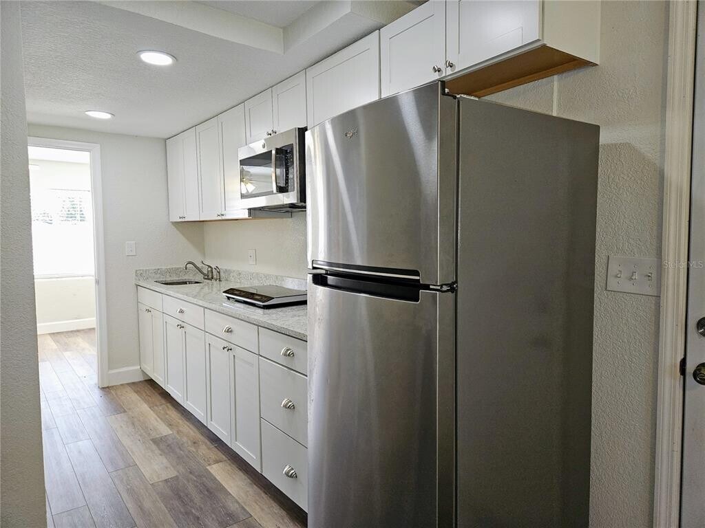 Apartment Unit attached to this duplex home is available for immediate Annual Lease. Private entrance on side of the home leads to this cute one bedroom,one bath apartment. Welcoming open Living Room with beautiful luxury vinyl flooring,a nice size kitchenette with solid surface countertops,white shaker-style cabinets,full size refrigerator,and built-in microwave. Spacious bedroom and fully updated bathroom with single vanity and walk-in shower. Convenient washer and dryer in the apartment. Quiet neighborhood in this conveniently located Tampa community. Rent includes yard maintenance. Landlord will cover electricity up to $120 and water up to $50 for 1 person. One pet up to 35 lbs with approval. Application fee $65 per adult and $100 tenant processing fee. MLS# TB8452547