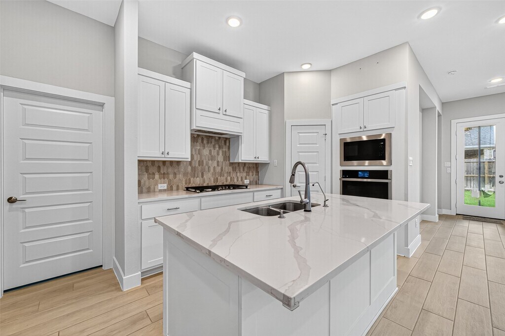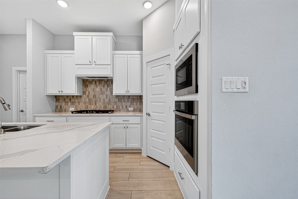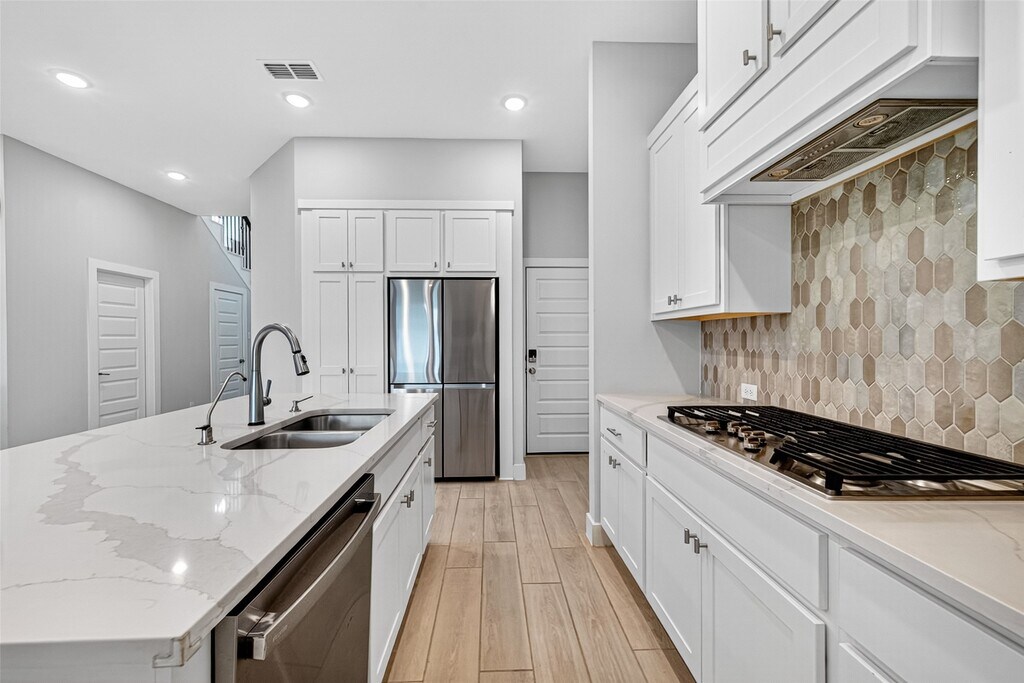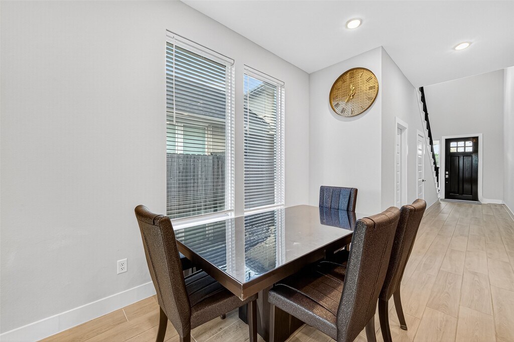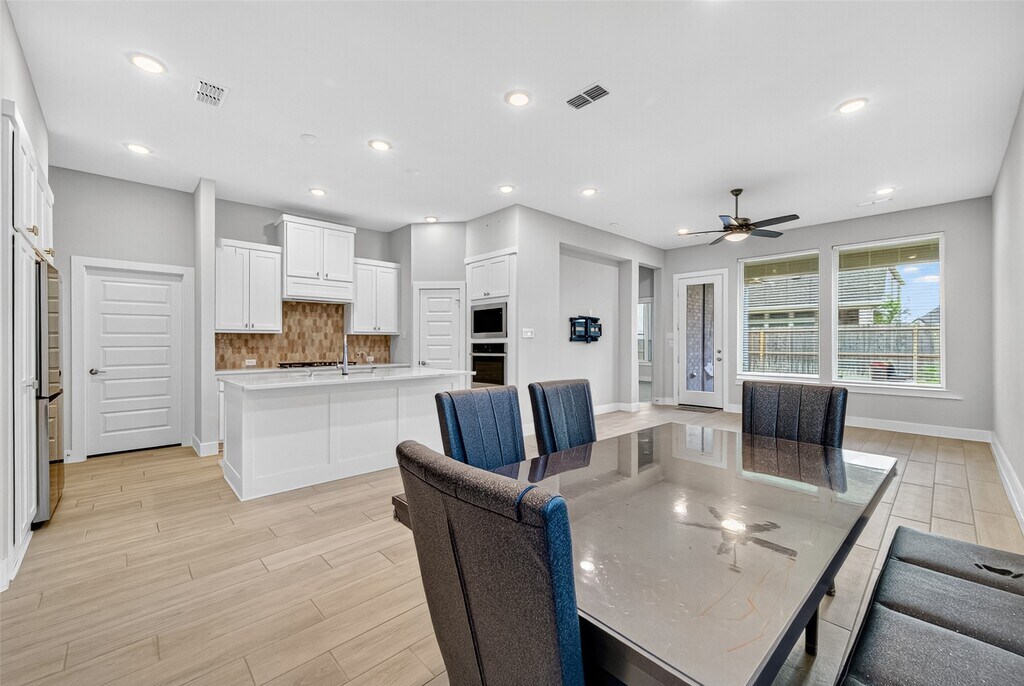 Beautiful two-story brick home located on a cul-de-sac in the Harvest Green community. The exterior highlights a light brick façade,landscaped front yard,covered entry,and attached two-car garage. Inside,the home opens to a tall foyer with wood-look tile flooring,iron spindle staircase,and abundant natural light. The open-concept main level features a spacious living area,dining space,and a modern kitchen with a large island,white cabinetry,tile backsplash,and stainless steel appliances. Multiple large windows overlook the backyard,complemented by covered and open porch areas. Upstairs and downstairs layouts provide generously sized rooms and flexible living options,while the private fenced backyard offers outdoor enjoyment. MLS# 92620452
