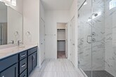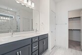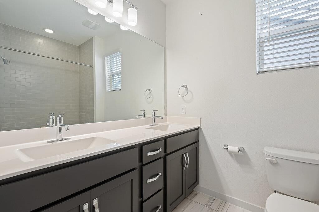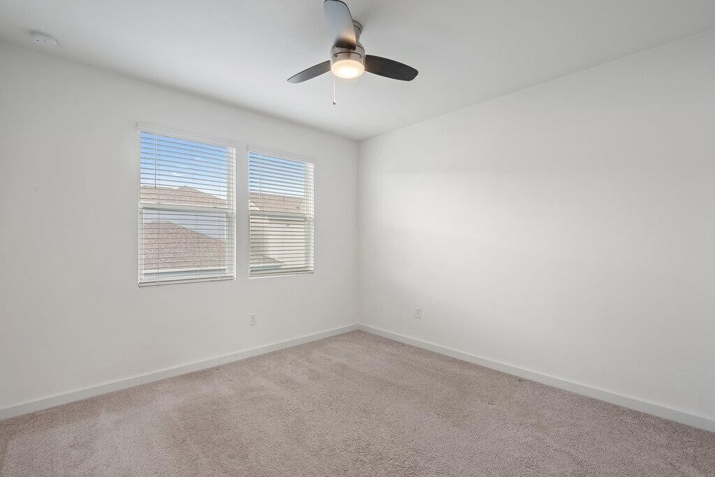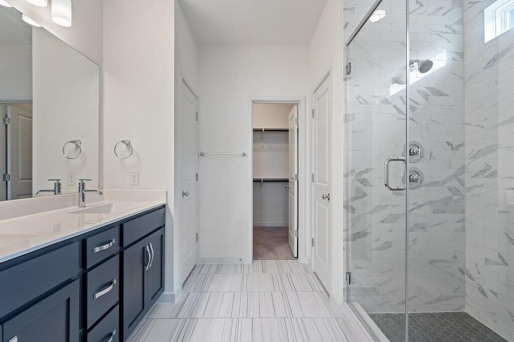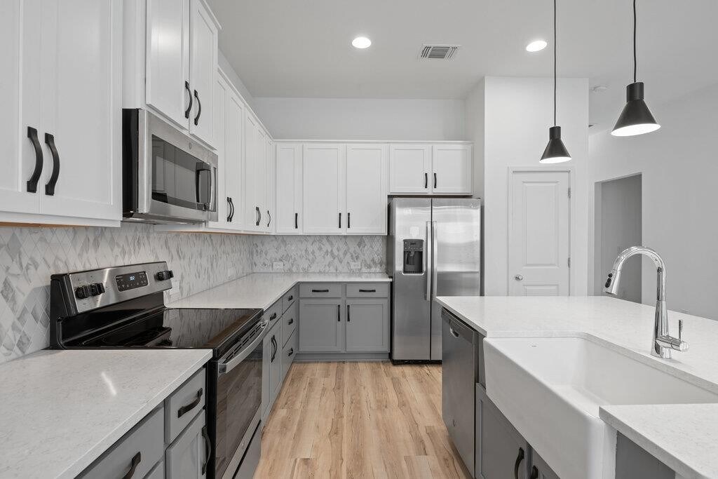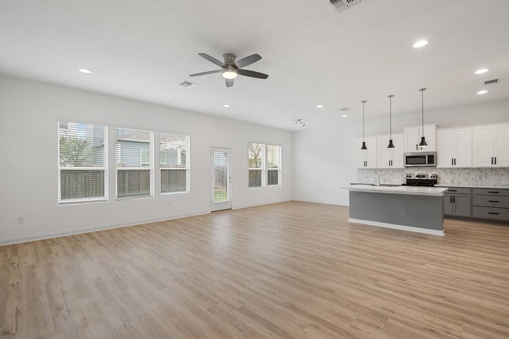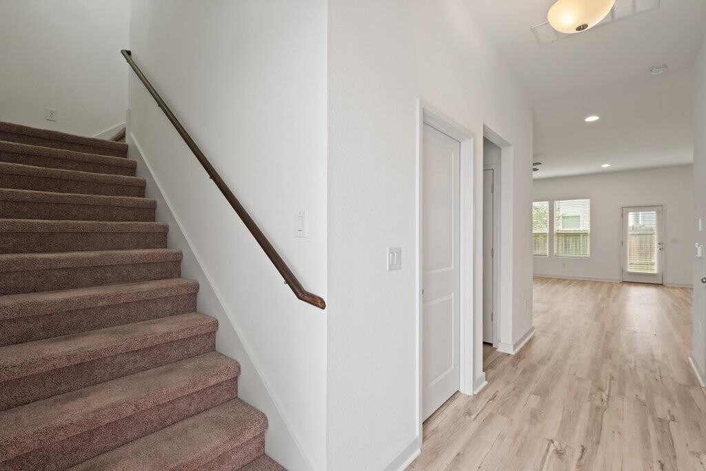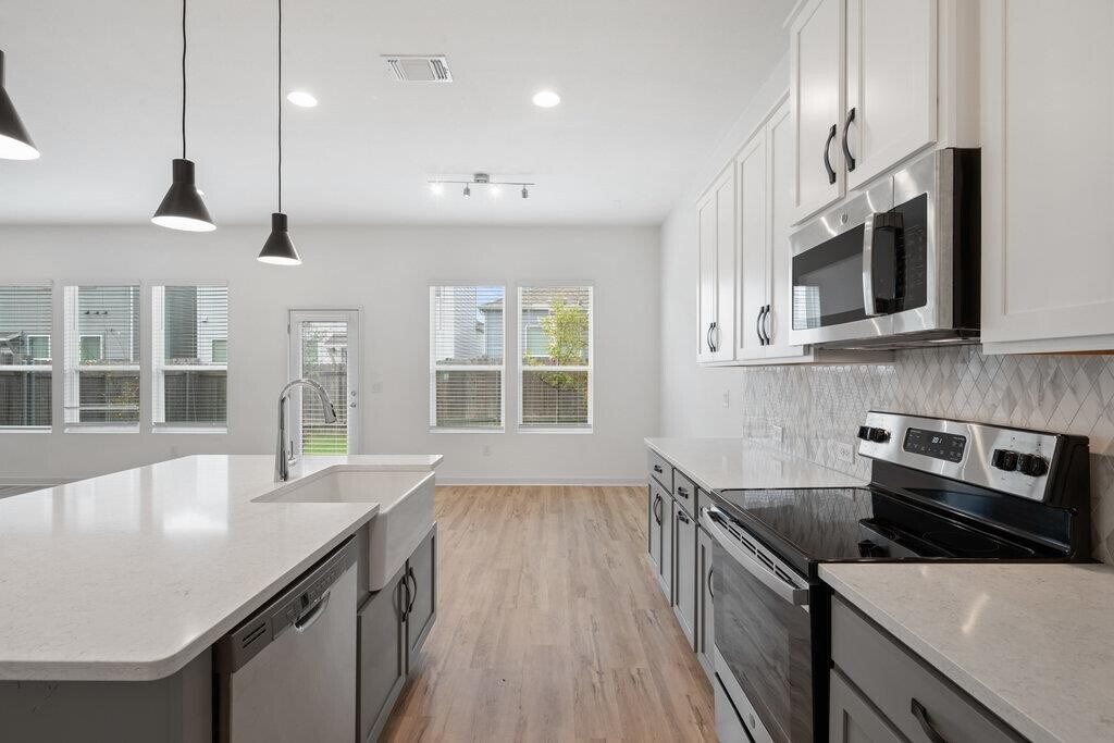 Bright & modern 3 bed, 2.5 bath home in a gated community. Featuring vinyl plank floors and abundant natural light, the open floor plan is perfect for entertaining with a beautiful kitchen anchored by a large center island and boasting quartz countertops, tile backsplash, and stainless steel appliances. Upstairs, the primary suite features an ensuite bath with a double vanity, walk-in shower, and walk-in closet. Private primary suite on the main floor with double vanity, walk-in shower, and walk-in closet. The two additional bedrooms upstairs are generously sized and share a spacious secondary bath with a double vanity. The private backyard & patio are perfect for gardening, barbecueing, or simply relaxing. The front yard is maintained by the HOA for an easy lock-and-leave lifestyle. Great location, less than 5 miles from the Domain and Q2 Stadium.