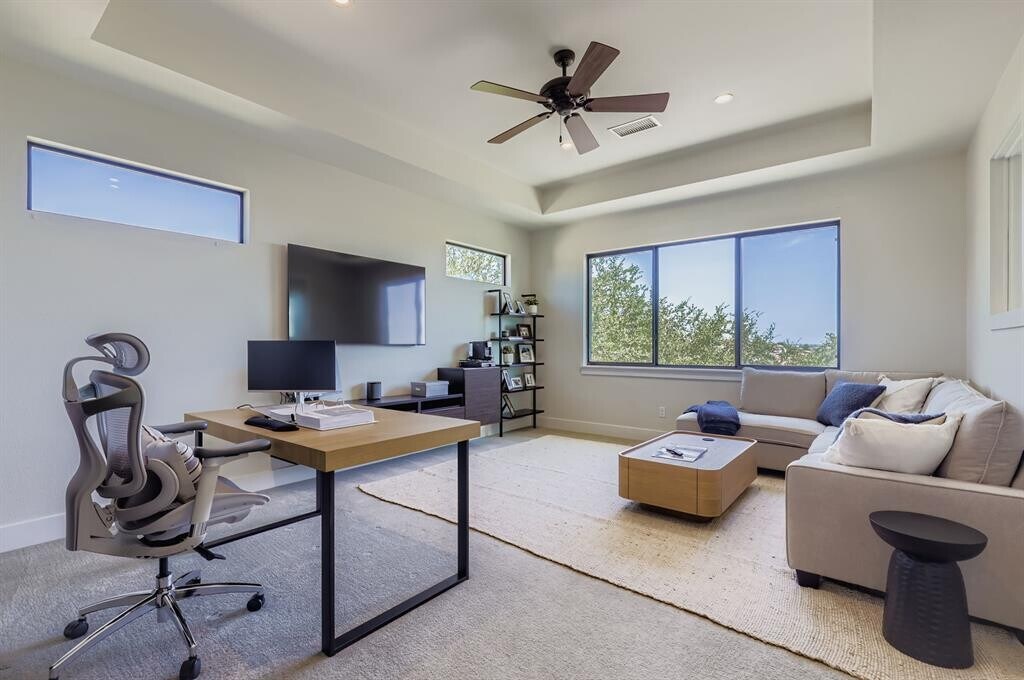Modern Hill Country home nestled up to City of Austin greenspace/greenbelt providing beautiful, vast, serene views! Balcones Canyonlands Preserve & access is near the end of Barrie Dr. just a short walk! Beautiful 4 BR, 3 BA, oversized 2 car garage with EV charger and workshop! Texas stone and stucco exterior with elegant architectural elements. The entry opens up to a view of the living room, formal dining, kitchen, and front office all with large windows showcasing natural light and private outdoor space. High ceilings and modern finishes throughout give this expansive home an even larger and spacious feel. Primary suite features a separate shower, soaking tub and generous walk-in closet all on main floor! Main floor utility room. 1 guest/secondary bedroom & full bath downstairs as well. Upstairs features 2 bedrooms, full bath, media/game room with awesome views and barn door to close the room off. Exquisite RH lighting. The kitchen showcases stainless appliances, including a smart refrigerator. Beautifully landscaped grounds compliments this home. The home is ideally positioned for living convenience only a couple of minutes to the shopping and dining centers of Lakeway with direct access to RR620. The City of Lakeway offers amenities including exemplary schools, city services and government, hike and bike trails, pool with water slides, lap pool, skate park and so much more! Multiple boating marinas and golf courses are just a few minutes away. 35 minutes to DT Austin and the airport. Lake Travis ISD.