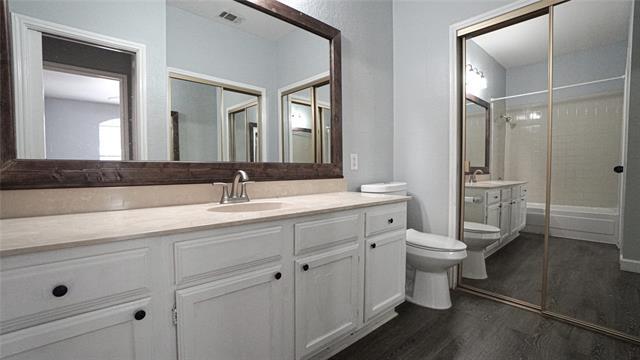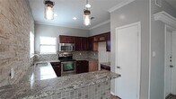 Charming move-in ready home for lease in Mesquite! Conveniently located just off Highway 80, offering easy commuting access. This delightful property features 3 bedrooms and 2 full baths. The main level showcases a spacious open floor plan, perfect for entertaining. The living room highlights a decorative brick fireplace and wood accent wall, seamlessly connecting to the dining and kitchen areas. The eat-in kitchen comes complete with a breakfast bar, stainless steel appliances, granite countertops, and a stunning stone accent wall. The primary bedroom, located on the main floor, sits adjacent to a full bath with his-and-her closets. A beautiful wood staircase leads to two additional bedrooms with generous closet space, one featuring custom built-ins, and they share a full bath. The home offers alley access with a gated driveway and a large, private backyard enclosed by a wood fence. Don't miss out on this incredible opportunity—schedule your showing today!