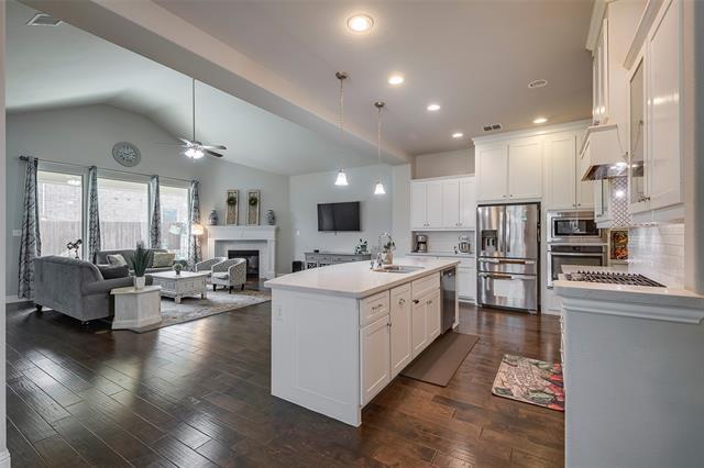 POPULAR DREES Brendan open floor plan on a corner lot boasts four bedrooms, three full baths, office, extra office nook, huge walk in pantry, tankless water heater, gas fireplace, ceiling fans throughout, media and game room and a 3 car epoxy garage in the desirable SEVENTEEN LAKES SUBDIVISION and TOP NOTCH Northwest ISD. Open wide foyer greets you with high vaulted ceilings and a stunning curved staircase which leads upstairs to the two bedrooms, full bath, game and media room. Kitchen exaggerates a large natural stone island, an abundance of white crisp cabinetry with tons of storage, stainless steel appliances, four burner gas cooktop, and recycle bin. Take many walks throughout the community on multiple trails that meander around many catch and release fishing lakes. Community offers two pools, two playgrounds, BBQ grills, splash pad, and so much more. Just minutes away from major highways, and the DFW airport.