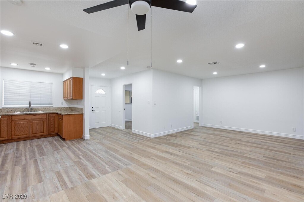 Welcome to this charming vintage home in Las Vegas! This beautifully maintained 3-bedroom, 2-bathroom residence offers a bright, open living area with laminate flooring throughout. Enjoy city views from the expansive lot — ideal for boat or RV parking. Features include ceiling fans, and an oversized storage area for all your extra needs. (A fireplace that is currently non-operational and will not be repaired)