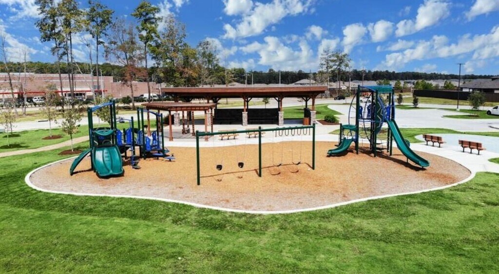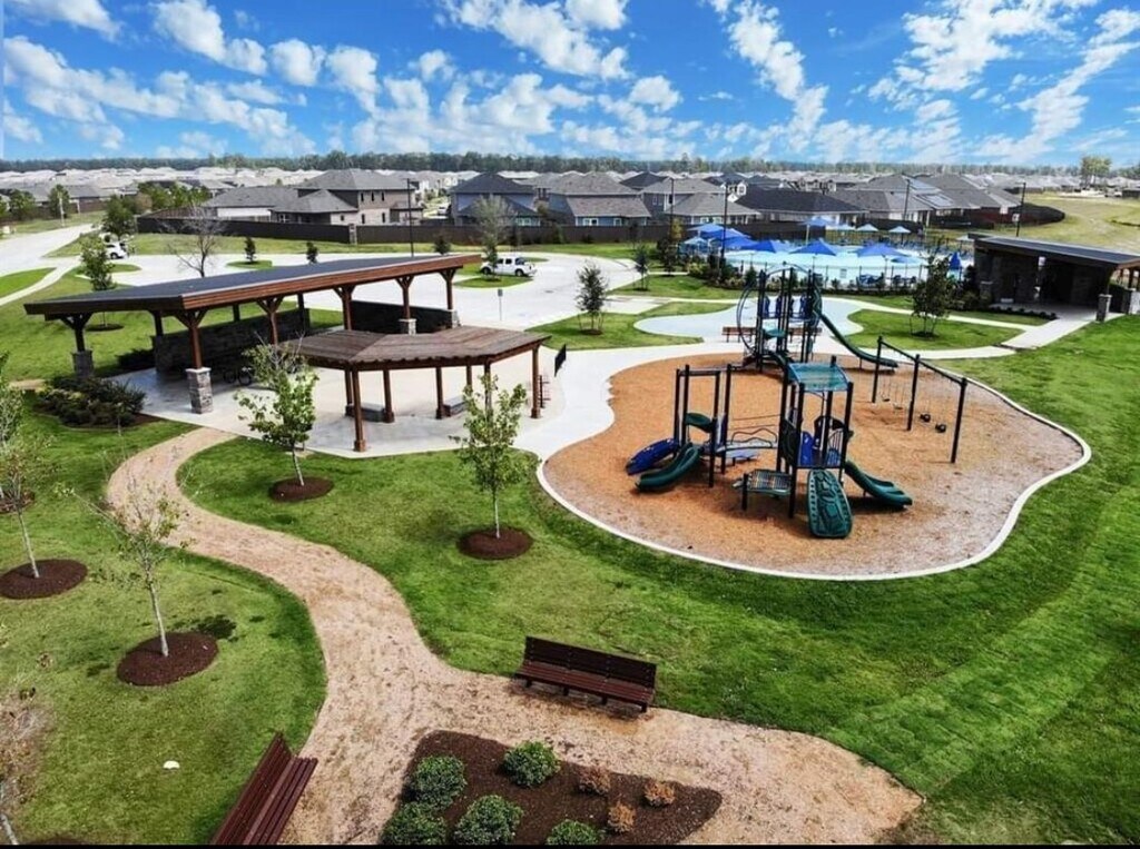 Newer construction 2-story DR Horton home in Harrington Trails features 4 bedrooms and 3 bathrooms with an open-concept layout,including two downstairs bedrooms with private baths perfect for guests or multi-generational living. The home offers energy-efficient features for savings,all appliances included,and vinyl plank flooring for easy cleaning. Residents enjoy community amenities such as a resort-style pool,pavilion,playground,and walking trails,with Timber Lakes Elementary School just a short walk away. Conveniently located near Hwy 59 and 242,this home combines modern comfort,move-in ready features,and an amenity-rich community. MLS# 70680818