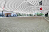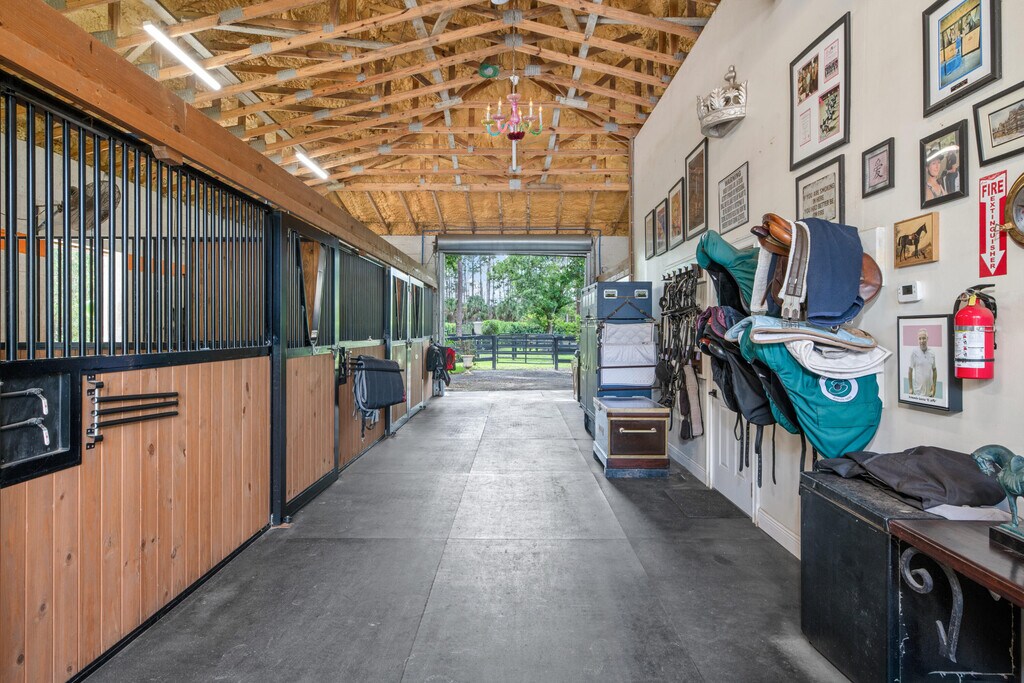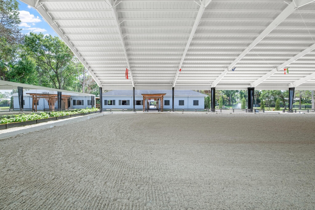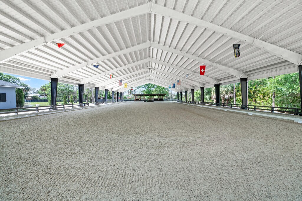 Set beneath a canopy of mature oak trees and just 13 minutes from Wellington International, this exceptional equestrian estate offers a rare blend of top-tier equestrian facilities and refined residential living, all within a private, beautifully landscaped five-acre setting. The property features two CBS barns totaling 17 stalls, thoughtfully designed with custom stall fronts, elegant chandeliers, and quality finishes throughout—creating a polished yet highly functional environment suited for both professional operations and private use. At the heart of the farm is a newly constructed 2022 covered arena (120 x 190). The arena is appointed with GGT footing, an advanced Ebb & Flow watering system, custom mirrors, and a spacious viewing area, delivering a consistent and elevated experience Supporting the facility are eight irrigated paddocks, a round pen, tack room with lounge, feed rooms, full bathroom with wood tile accents, laundry, and exceptional groom's quarters, offering a fully equipped, turnkey setup. The completely remodeled 5-bedroom, 3-bath residence seamlessly blends comfort and style. The chef's kitchen is centered around a dramatic 15-foot island with quartzite countertops, stainless steel appliances, and a wine chiller, ideal for both everyday living and entertaining. The primary suite offers a private retreat with a wood-burning fireplace, an expansive custom walk-in closet with seating area, and a beautifully appointed bath featuring dual vanities, a soaking tub, and a walk-in shower with dual shower heads. A guest ensuite bedroom provides additional comfort and flexibility for visitors. Outdoor living is equally impressive, with a private, fenced pool terrace finished in travertine with custom turf inlay, creating a clean, architectural aesthetic with a relaxed, resort-style feel. The grounds also feature a pond with a dock and seating area, a fenced dog park, and a gazebo ideal for entertaining or quiet evenings outdoors. Surrounded by lush landscaping and natural shade, the property offers both privacy and functionality, with a layout ideal for a boutique training operation or private equestrian retreat—just moments from the heart of Wellington's world-class competition venues. Rental Terms: Annual: $36,667 Per Month