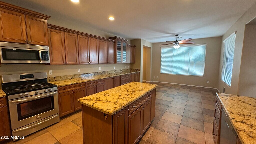 Stunning 6-bedroom home located in the highly sought-after community of Royal Ranch in Surprise,Arizona! This spacious and energy-efficient residence features an OWNED solar system,helping to keep summer electric bills low. The well-designed floor plan offers formal living and dining areas,a generous family room,a large upstairs loft,and a rare 4-car tandem garage. The open-concept kitchen is perfect for entertaining,complete with stainless steel appliances,granite countertops,a large center island with breakfast bar,ample cabinetry,and a convenient butler's pantry. A full bedroom and bathroom are located on the main levelideal for guests or multigenerational living. Upstairs,you'll find four oversized bedrooms,a luxurious primary suite with sitting area,separate tub and shower,and a spacious walk-in closet. The second floor also includes a huge laundry room with a utility sink and plenty of storage space. Step outside to enjoy the private backyard oasis,featuring a sparkling pool with water feature. Located just minutes from the Texas Rangers and Kansas City Royals Spring Training facilities,this home also offers quick access to Surprise Community Park,where you can enjoy scenic walking trails,a fishing pond,tennis and pickleball courts,and plenty of outdoor recreation. This home truly has it allluxury,space,and a prime location close to everything Surprise has to offer!