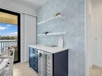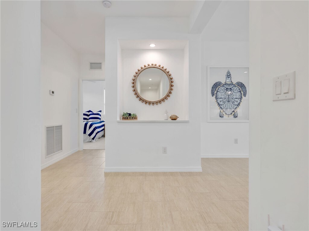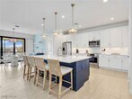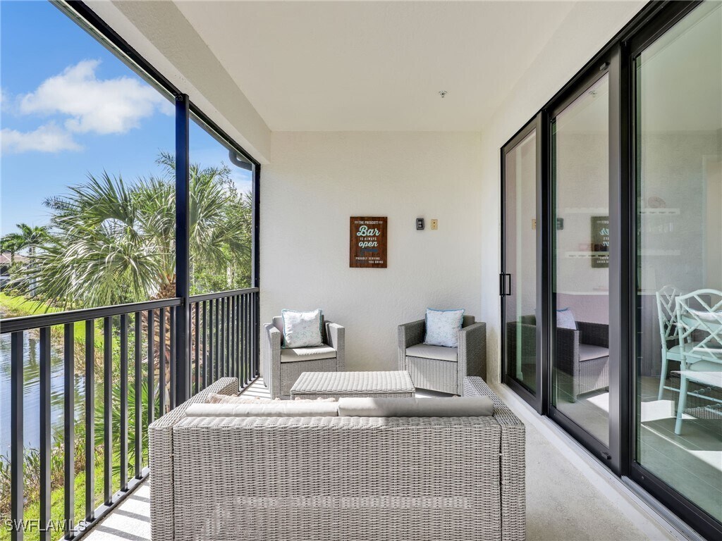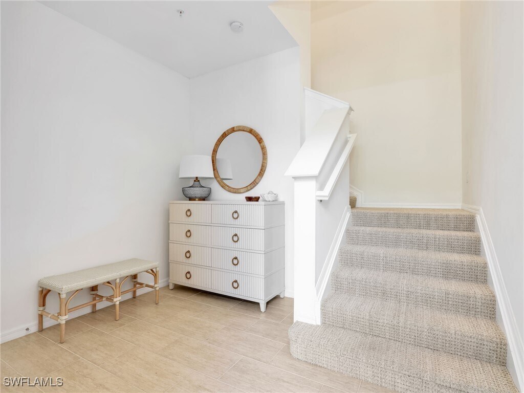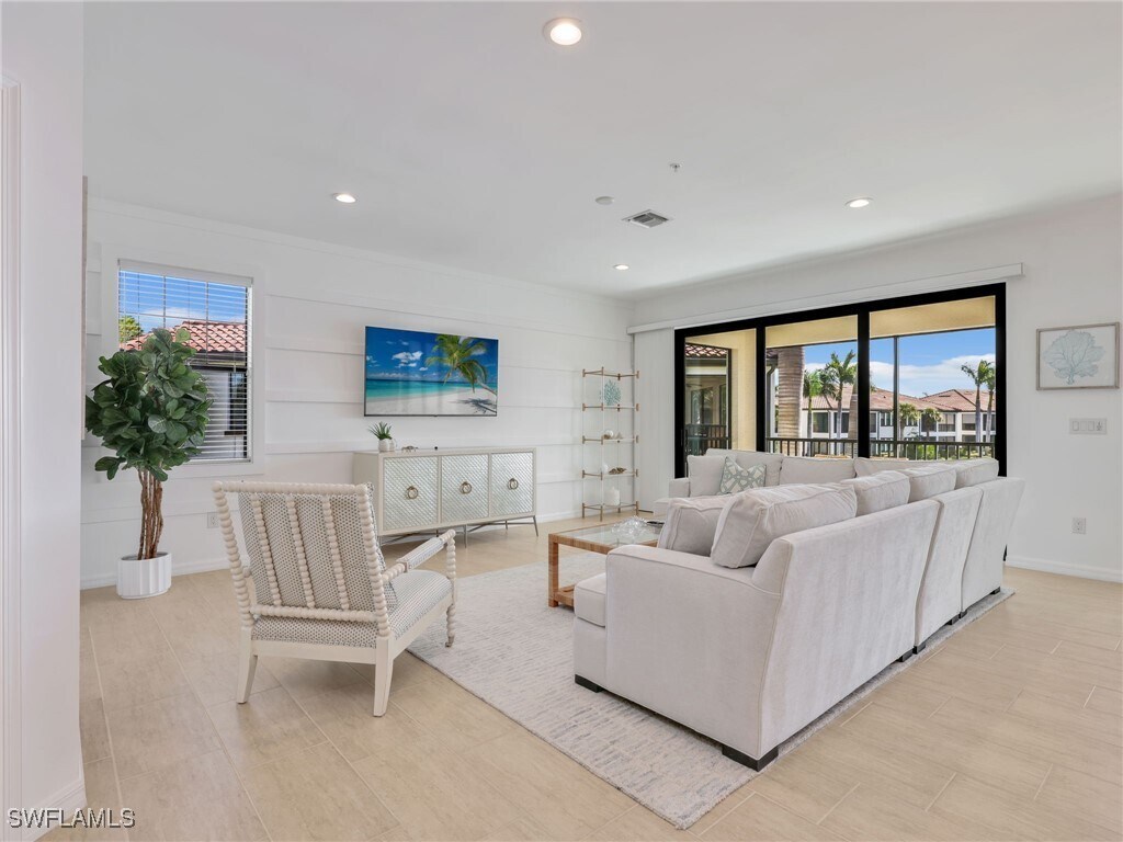 Coastal style at its finest! This beautifully updated turnkey furnished end-unit carriage home in the highly sought-after gated community of Livingston Lakes in North Naples blends coastal elegance with modern comfort. Offering 2,152 sq ft of living space,this light and bright second-floor residence features 3 bedrooms (one currently set up as a sitting room with a couch),2 full bathrooms,and a den with French doors set up as a home office. The open-concept great room layout is perfect for both relaxation and entertaining,while the chef’s kitchen impresses with white shaker cabinets,soft-close drawers,a stunning oversized navy-blue island with shiplap detail,Calcutta gold quartz countertops,white chevron tile backsplash,under-cabinet lighting,glass pendant lights,a large Blanco Silgranit sink,and newer Bosch stainless steel appliances. The dining area includes a built-in bar with a beverage fridge and shelving,and a table with six chairs. Additional highlights include 12x24” tile flooring in main areas and den,plush newer carpeting in bedrooms,designer coastal furnishings from Baer’s,Serena & Lily,and Arhaus,custom lighting and fans (including Crystorama and Minka Aire),a laundry room with LG front-load washer & dryer and cabinets,whole-house Culligan carbon water filtration system,and an oversized 2-car garage with extra storage and a second refrigerator. The living area showcases a custom feature wall with a mounted TV. Off the great room,six hurricane-impact sliders lead to a large screened lanai with dining and lounge seating overlooking a tranquil lake and fountain with southeast exposure. The spacious primary suite features a generous walk-in closet and a luxurious en-suite with dual sinks,quartz countertops,gray shaker cabinets with drawers,and a frameless glass shower. The guest bathroom is equally stylish with Serena & Lily wallpaper,a navy vanity,quartz counters,and a tiled tub/shower. Enjoy resort-style amenities including a resort style pool with cabanas,fitness center,fireplace,grills,and community room with kitchen,plus a vibrant social calendar with monthly food trucks,dine-arounds,holiday parties & social events. Ideally located within walking distance to North Collier Regional Park and Seed to Table,easy access to I-75,just 6 miles to the beach,and minutes to Publix,Target,and all Immokalee Rd has to offer. This exceptional home offers the best of the Naples coastal lifestyle,perfect for your winter retreat!