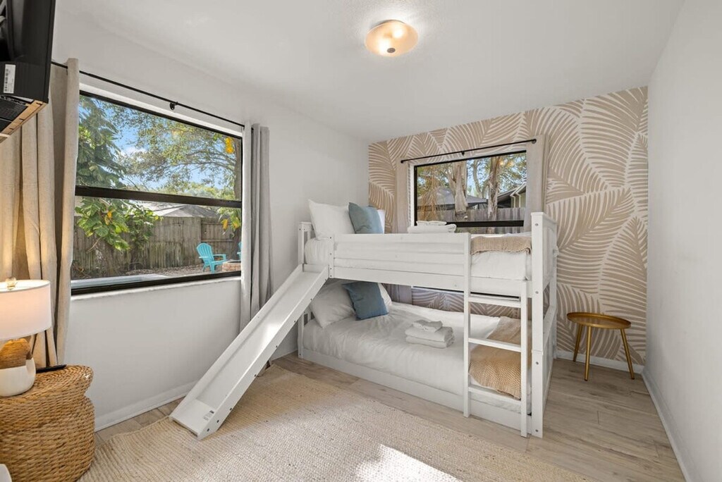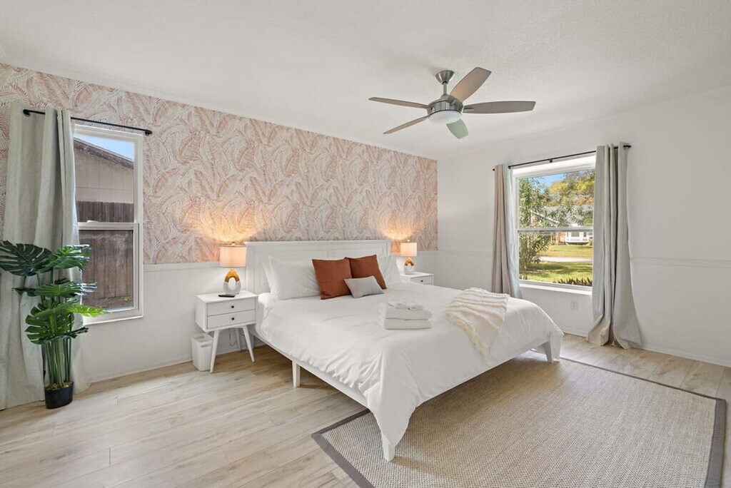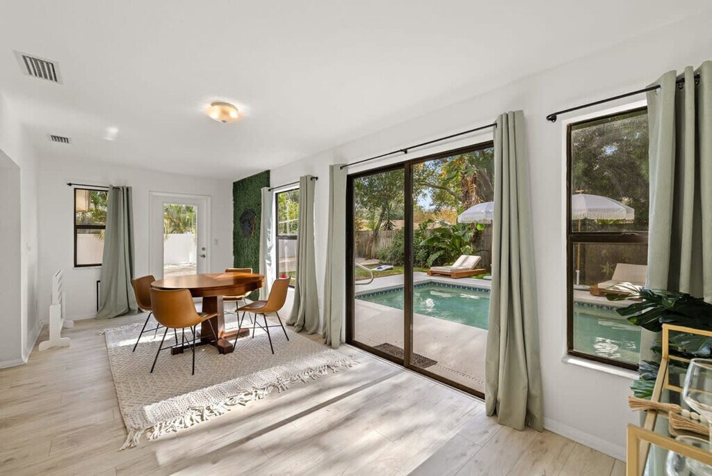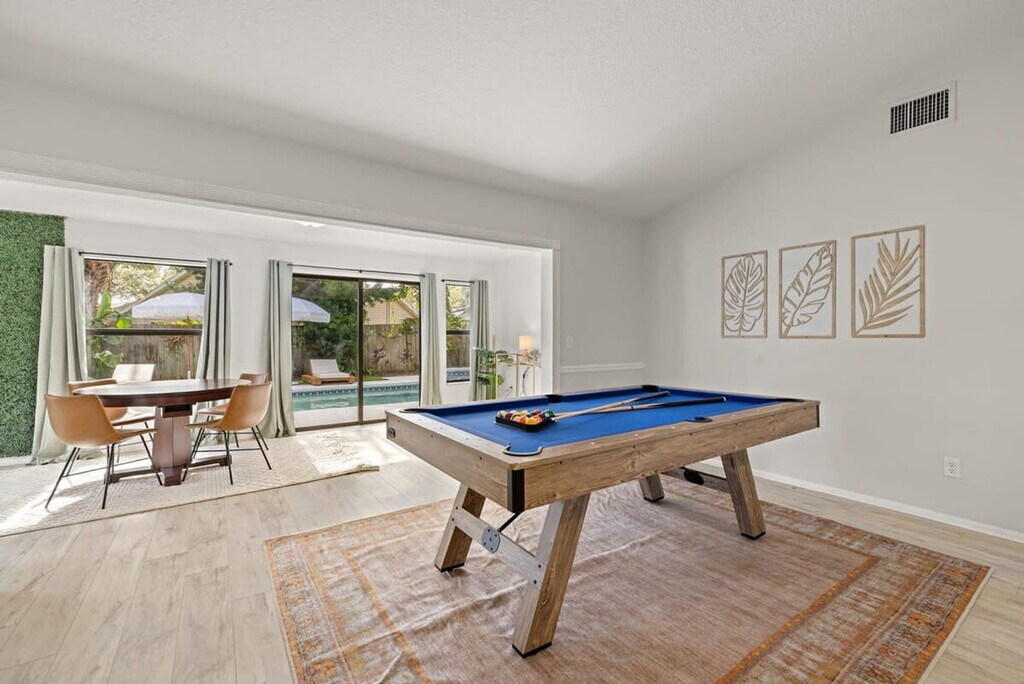 Feel at home in this charming oasis in Palm Harbor, Florida. This luxurious retreat is designed to be more than just accommodation—it's a space where lasting memories are made. With its thoughtful design, this haven can comfortably house up to ten guests. The heart of this retreat lies in its fully equipped kitchen, the perfect space for those who love to whip up delectable meals. The four bedrooms and two bathrooms provide a sense of spaciousness and privacy. Entertainment options abound with a poker, ping pong and pool table, board games, a private sand volleyball court, cornhole, a fire pit with seating, and smart TVs in every bedroom. The standout feature is undoubtedly the amazing pool, surrounded by shaded lounge chairs. A charcoal grill is also available. This property is dog friendly. Up to 2 dogs are allowed for a pet fee of $125. A pack n play and high chair are provided for added convenience. Driveway parking is available for a maximum of 4 cars. What sets this retreat apart is its strategic location—4 miles to Honeymoon Island. Uber and Lyft are reliable modes of transportation. Absolutely no parties are allowed, grounds for termination. The house is outfitted with an exterior Minut noise device, which monitors noise decibels (does not record) in an effort to be respectful of our neighbors. Quiet hours per the city of Palm Harbor are from 10pm-7am. There is a ring camera at the front door and 2 on either side of the house solely for security purposes. The side cameras are not active as we do not have access to them. The pool is not heated, but in the summer months, expect it to be warm naturally. You are vacationing in a residential area. Please be a good neighbor by keeping the noise to a respectful level during the day and night. Excessive and unreasonable noise can deprive neighbors of the peaceful enjoyment of their private property. To book this listing you must be over 25 years old. Registration Number: DWE2104458 [SI]