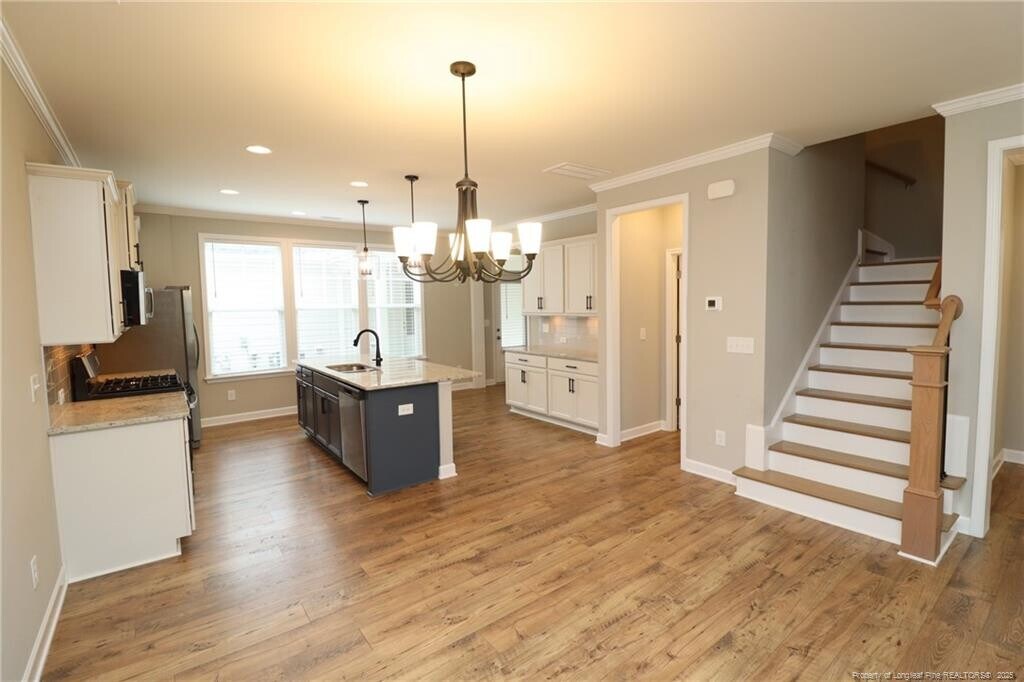 This dazzling Wake Forest townhome is available immediately and offers the perfect combination of location, luxury and liveability! All of the garages on this street are accessible via rear alleys, so the front facades of these homes aren't cluttered. Your guests can park right in front of your home and be welcomed inside via the expansive, covered front porch. The foyer opens on the left to an expansive, open-concept living area showcasing tall ceilings, copious amounts of natural light, luxury plank flooring throughout and a design that works perfectly for today's lifestyle. The family room includes double picture windows, a ceiling fan, crown molding and a design that makes furniture placement a breeze. The family room seamlessly intertwines with an adjacent, perfectly-proportioned dining area that includes a custom chandelier. On the other side of the dining area, you'll next enter 152 Etteinne Garden's fantastic kitchen. The center attraction" is undoubtedly the massive, granite-topped island that includes an integrated breakfast bar, a double-bowl undermounnt stainless sink, retro-inspired pendant lights and a contrasting blue cabinet color. Flanking the front and rear of the island, you'll find additional granite countertops accentuated by a custom-tiled backsplash with under-cabinet lighting that looks phenomenal in the evenings. The kitchen is also home to a full suite of sleek, stainless-steel appliances, including a gas oven, a built-in microwave and a refrigerator with ice and water in the door. Around the corner, you'll find an expansive walk-in pantry that offers all the food storage space one could ever need. On top of that, the shelves are solid wood, not the annoying wire shelving that seems to be so commonplace these days. The hallway to the rear of the home offers a super-convenient "drop-down" space with cubbies, hooks and an integrated bench; this provides the perfect space to keep everyday clutter organized, yet easily-accessible. Next, take a quick jaunt up the hardwood-clad staircase to the second floor that's home to all 3 bedrooms. At the top of the stairs, you're greeted by a spacious landing area. The primary bedroom occupies the front half of the home and this space must be seen to be believed! The bedroom features a tray ceiling with crown molding, double windows, a ceiling fan and an accent wall with custom trim work. You'll fall in love with the walk-in closet that includes solid wood shelving as well as direct access to an adjoining laundry room (the laundry room also opens on the other side to the 2nd floor hallway for alternate access). The primary bathroom showcases tiled flooring, a brushed-finish, marble-topped, elevated vanity with dual sinks atop blue cabinetry, double mirrors, a linen closet, a water closet and a retro-inspired, walk-in shower with hexagonal floor tiles, a bench and dual niches. Not to be outdone, bedrooms #2 and #3 are also quite spacious with tall ceilings, ample closet space, great natural light and convenient access to a full hall bathroom with a marble-topped vanity and a tub/shower. Before wrapping-up your tour, be sure to visit the covered patio with a ceiling fan as well as the private backyard - this is truly an amazing outdoor living space! The covered patio also serves as a covered walkway between the 2 car garage and the house ensuring you'll never be rained on again while unloading groceries."