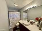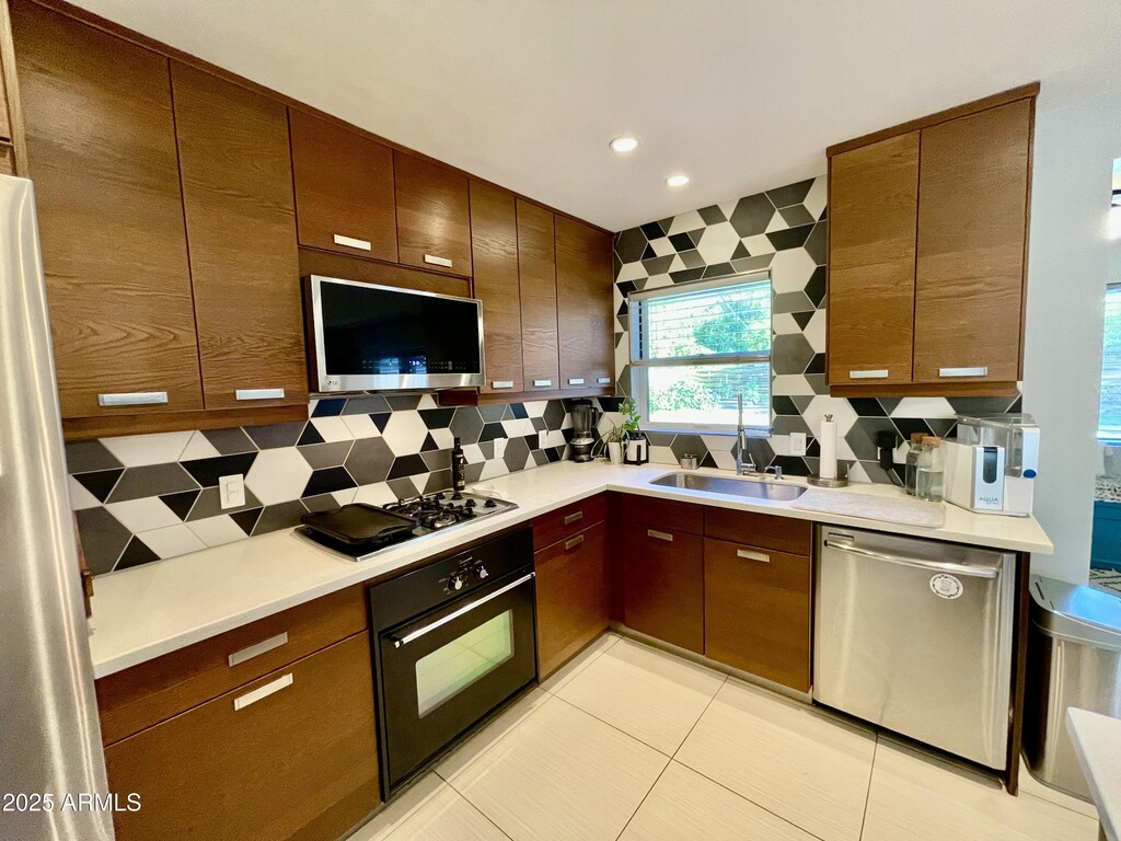Stunning Remodeled Mid-Century Home in Hoffmantown. This beautifully updated red-brick home offers 4 bedrooms and 3 baths with a desirable split floor plan. The open living and dining space is accented by a custom see-through wood divider,creating a warm and stylish flow. The modern kitchen features flat-panel cabinetry,quartz counters,stainless steel appliances,and an adjacent nook perfect for a cozy sitting or reading area. The split primary suite boasts vaulted ceilings,a spacious closet,and 3/4 bath with quartz vanity and tiled glass shower. Two secondary bedrooms share a Jack-and-Jill bath,while all bedrooms feature generous closet space. Enjoy year-round entertaining in the large grassy backyard with multiple citrus trees,RV gate/parking,and a charming covered patio.- Additional features include dual-pane windows,updated blinds,and an interior laundry room with stack washer/dryer. Tile t/o except bedrooms. Home is equipped with EV CHARGER. Prime location. Just minutes to downtown,freeways,shopping,and Palo Verde Golf Course. Landscape maintenance included!