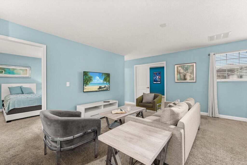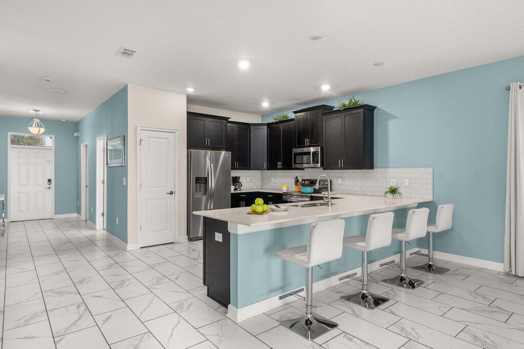 Experience a spacious and inviting house to feel at home for your Orlando getaway. This lovely home is located in ChampionsGate and features 7 bedrooms and 5 bathrooms. This home features 2 living areas, a free washer and dryer, a private pool, a game room, a large full kitchen with stainless steel appliances, and spacious indoor and outdoor dining areas. The family room is equipped with a flat-screen TV and leather reclining couches. The kitchen is fully stocked with everything you might need. Enjoy free access to the community water park and amenity center/clubhouse. If you would like to add pool and spa heating to your reservation, please let us know in advance, and we can coordinate to set that up for you. The cost for this amenity is $35 per day of stay, which will be invoiced separately. We kindly ask for at least a week's notice. Parking can accommodate up to 2 vehicles in the driveway parked back to back, and up to 1 vehicle on the street in front of the property. ChampionsGate is a gated masterplan community in ChampionsGate, FL. Enjoy a recreation-rich lifestyle with lavish amenities and nearby access to Orlando’s theme parks, like Disney World, along with shopping and dining at Posner Park. It's located 12 minutes from Disney World, 22 minutes from Universal Studios, and 20 minutes from SeaWorld. There is absolutely no smoking and no drugs allowed inside the home or elsewhere on the property. A maximum of 15 guests are allowed at any given time. Only the number of guests indicated on the reservation are allowed to stay overnight, unless otherwise agreed upon. The number of vehicles on the property should never exceed 3 per reservation. Be considerate while socializing outdoors after 10 pm and before 8 am, and keep excessive noise to a minimum during this time. No fireworks of any kind are allowed. No firearms are allowed on the property, unless kept locked in a vehicle. Check-out time is 10 AM. In the event you stay beyond the original scheduled check-out time, you may incur a fee of up to $300. [SI]