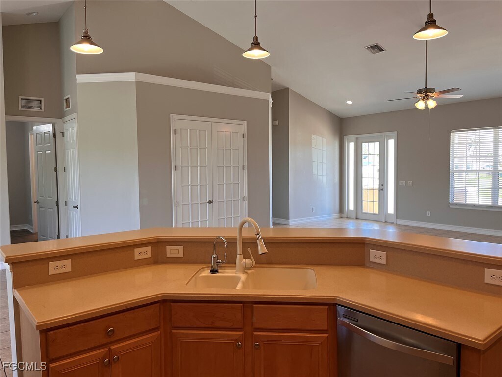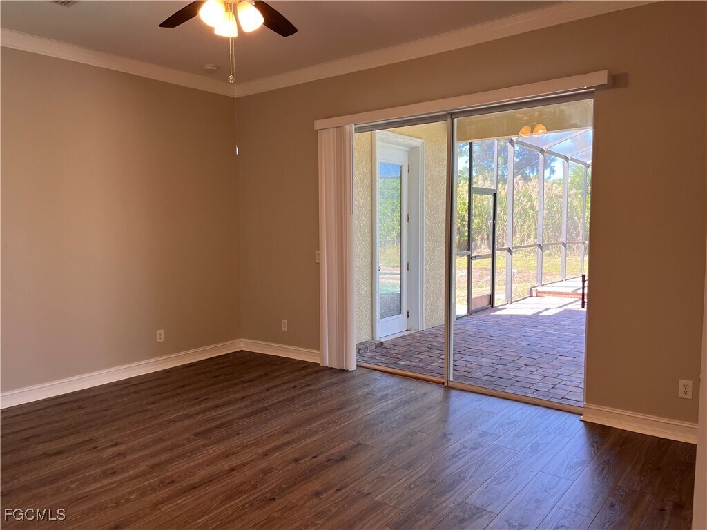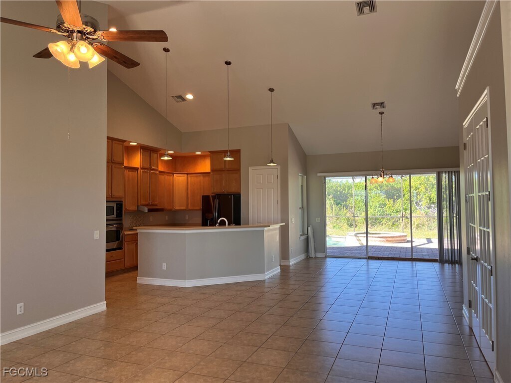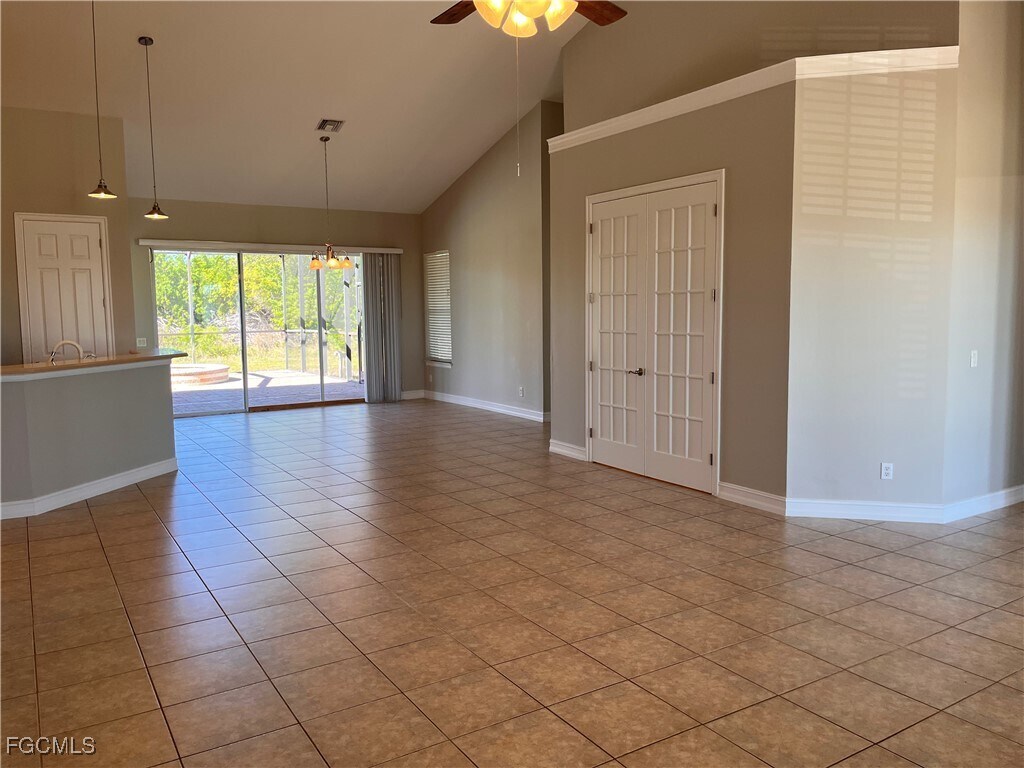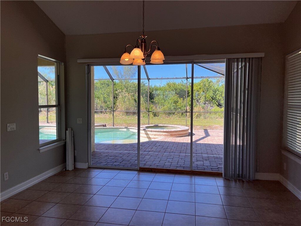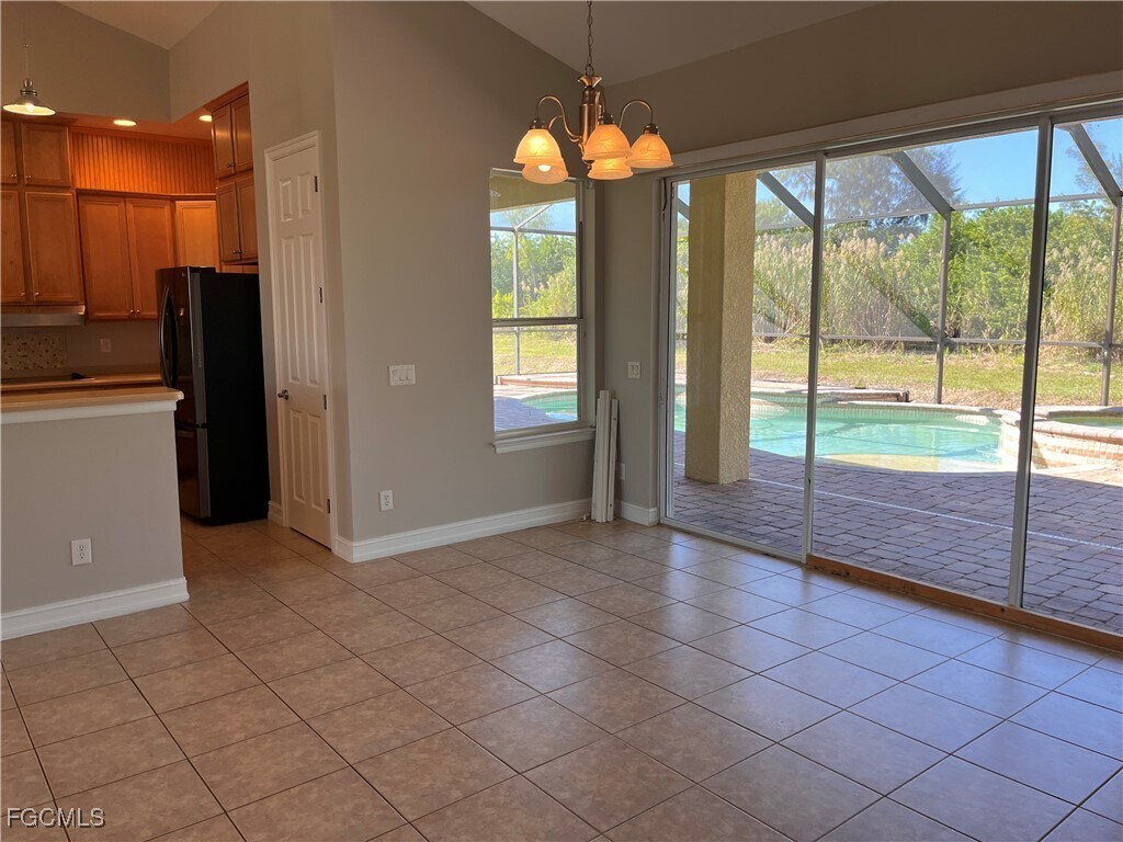 NEWLY AVAILABLE UNFURNISHED SINGLE-FAMILY ANNUAL RENTAL IN SOUTHWEST CAPE CORAL! Ding ding ding — this one truly checks all the boxes. Enjoy the relaxed Florida lifestyle in this charming Key West–style 3-bedroom plus den pool home with a 3-car garage. The curb appeal is unmistakable with its metal roof,inviting front porch,architectural cupola and large pavered driveway. Rent INCLUDES pool care and lawn care,offering maintenance-free living year-round. Inside,the home features a spacious great room floor plan with crown molding and tile or luxury vinyl flooring throughout (no carpet). The open kitchen offers raised-panel wood cabinets with crown molding,Corian counters,a breakfast bar/island,two pantries,and stainless-steel appliances — ideal for the home chef. The master suite enjoys peaceful pool views with sliders to the lanai and includes dual sinks,a soaker tub,and a separate shower. The guest bedroom wing features a Jack-and-Jill bath with a tub/shower combo. Ceiling fans are thoughtfully placed in the great room,bedrooms,and den for added comfort. Outdoor living is the highlight,featuring a full-length screened lanai,pavered pool deck,and a beautiful custom pool and spa with waterfall and sun ledge,plus a convenient pool bath. The large paver driveway leads to an oversized 3-car garage,and the property backs up to a private wooded area. Additional upgrades include impact glass windows,manual shutters for the sliders,and city water and sewer. Located in a highly desirable area near shopping,dining,and entertainment,this home is also walking distance to Trafalgar Middle School,Cape Coral Sports Complex,the Shops at Sandoval,and the Sandoval Farmers Market. Pets considered with owner approval. No smoking permitted. Credit and background check required,along with proof of income and no prior evictions. Agent/owner.