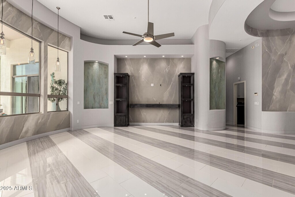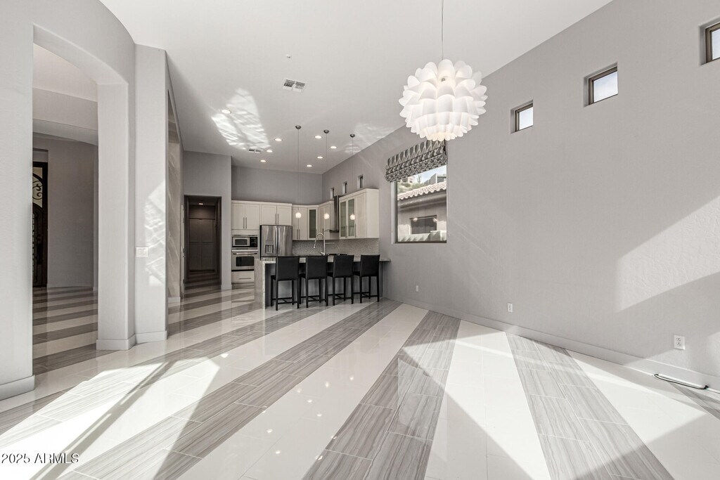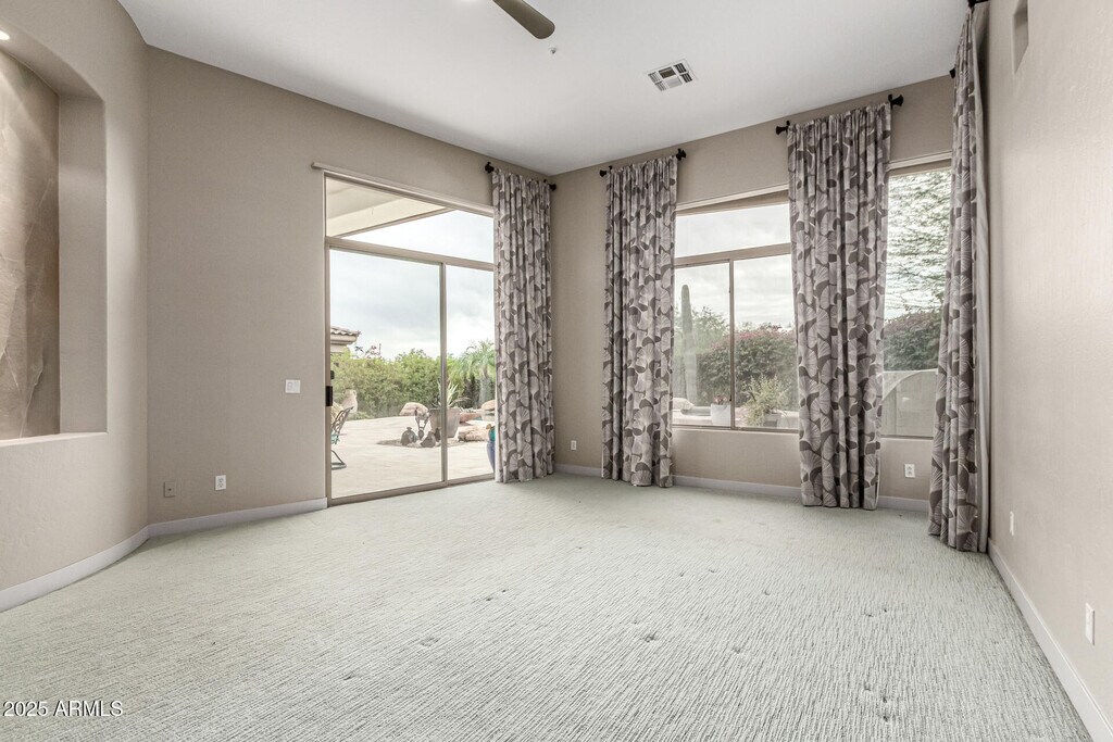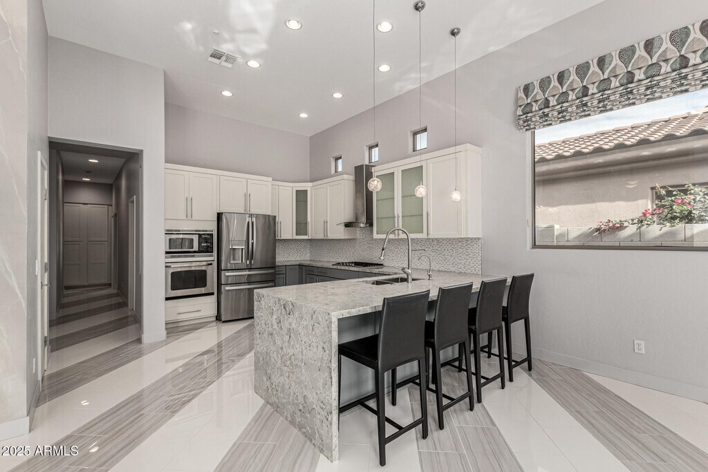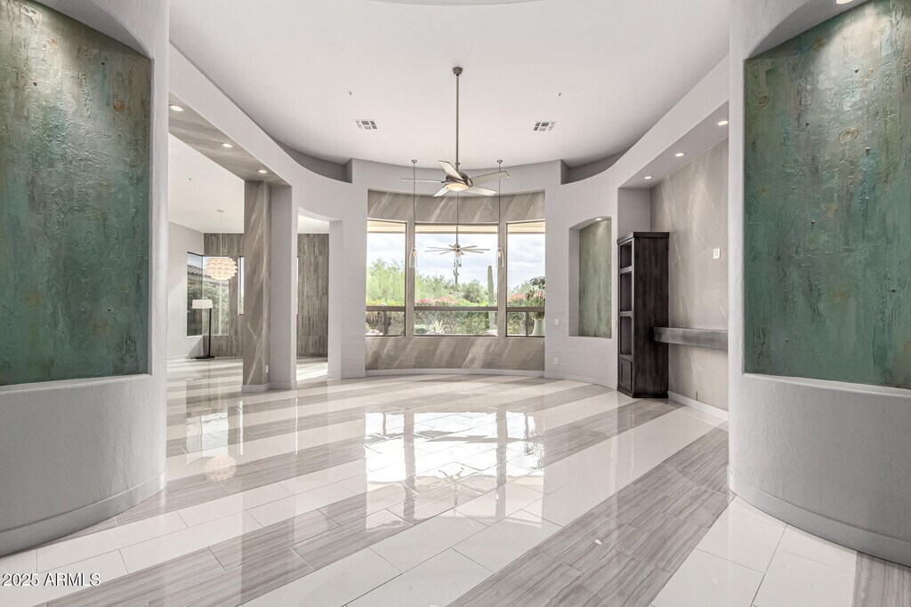 Experience upscale desert living in this stylish 3bedroom,2.5 bath plus office/bonus room single-level home located in the Fountain Hills gated community of Solitude at Sunridge Canyon. Soaring 12-foot ceilings and an abundance of natural light create a welcoming sense of space the moment you step through the upgraded custom iron entry door. The heart of the home is the beautifully remodeled kitchen,showcasing upgraded two-tone cabinetry,quartz countertops,and a striking waterfall-edge island. The split primary suite provides privacy and comfort and access to the backyard. It features a large walk-in shower,Roman tub,dual-sink vanity,and generously sized walk-in closet. The two guest rooms also nicely-sized. Outside,enjoy Arizona living at its best with a travertine-tile patio,sparkling saltwater pool and built-in spa,set against the beauty of Sunridge Canyon golf course. Whether you're lounging by the water or hosting friends on the expansive patio,this backyard is designed for year-round enjoyment. All appliances included. Pool and landscape service is included. One dog may be considered with landlord approval. Application fee is $60 per applicant. $20 per month tenant admin fee. $200 re-key fee at move in. No smoking allowed. Pet application fee is $30 per If a pet is approved non-refundable pet fee is $250 applies.