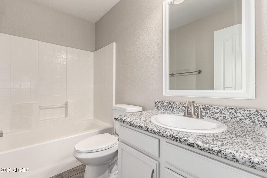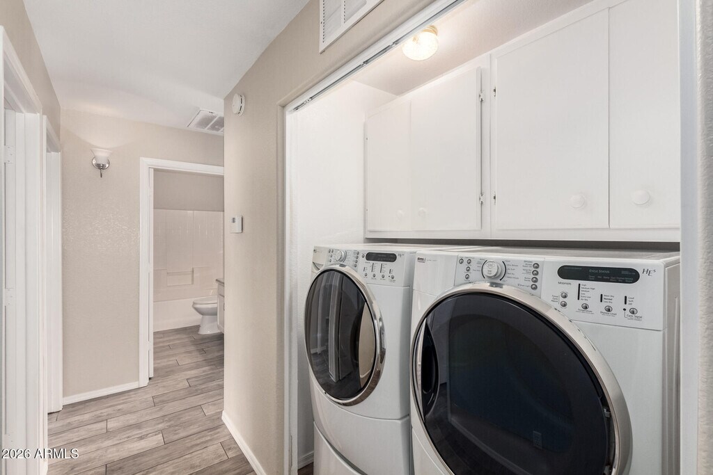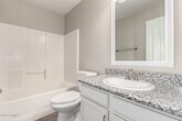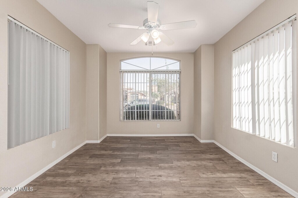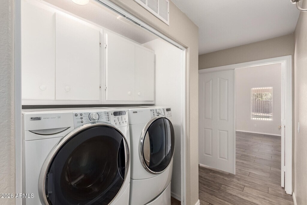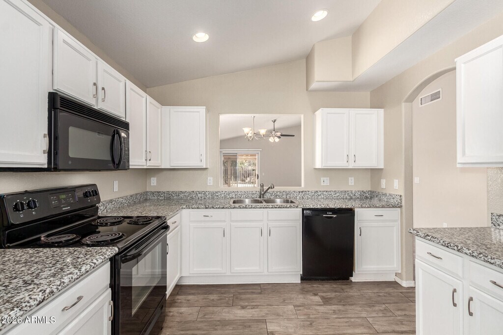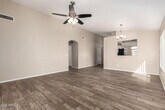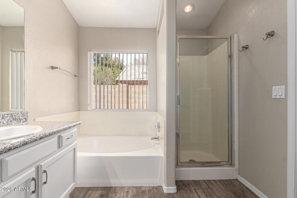 This beautifully maintained home sits on a spacious lot and features elegant wood-look tile flooring throughout,soaring vaulted ceilings,and a generous great room ideal for entertaining. The kitchen shines with crisp white cabinetry,granite countertops,black appliances,and a bright eat-in area surrounded by large windows. The expansive primary suite is a true retreat,offering dual sinks,a soaking tub,separate shower,a roomy walk-in closet,and private backyard access. Step outside to an extended covered patio,a sparkling pool,mature trees,and a lush grass area. A perfect blend of comfort and style in the heart of Gilbert--with pool service included!