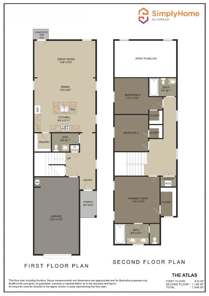 The Atlas plan is a delightful two-story home with 1946 square feet,3 bedrooms and 2.5 bathrooms,with a welcoming covered front porch. This open concept floor plan has a large living area with two-story ceilings,dining area,and half bath downstairs. The modern kitchen has granite counters and stainless steel appliances. All bedrooms are upstairs along with the conveniently located laundry room. Features include wood-grain vinyl plank flooring,fenced backyard,and a sprinkler system. All homes are SimplyMaintained for a $100 monthly fee that includes front and back yard lawn care and exterior pest control. MLS# 83110524