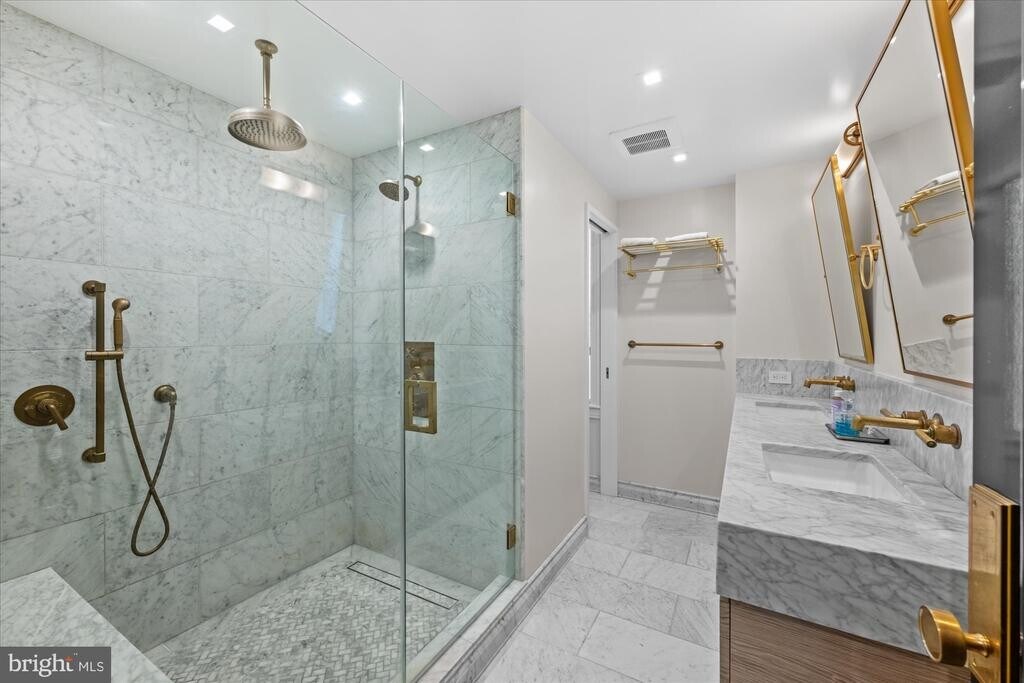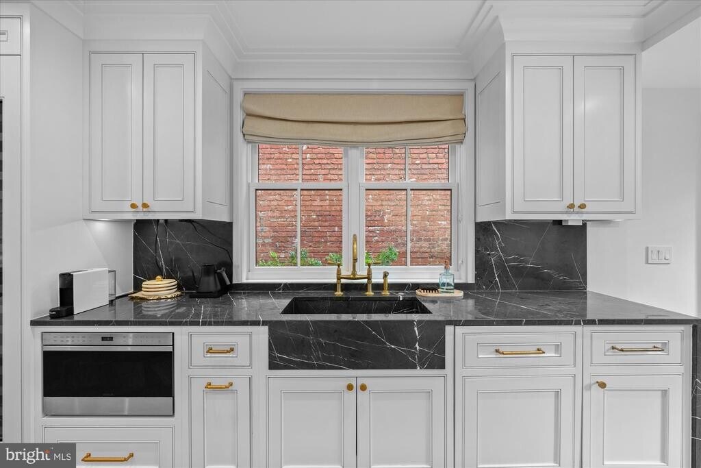 Originally built in 1885, and located on one of the cities most picturesque blocks in Logan Circle, this 5bdr/3.5 row home was completely renovated in 2020 by Akseizer Residential. This special residence blends historic charm and character with modern luxury and high-end finishes. ◠The main level features custom herringbone floors, an open living room with a gas fireplace and custom built-ins, a spacious dining area. The custom chef’s kitchen features custom marble, high end appliances including a Wolf 6-burner range and a floor-to-ceiling wine refrigerator. A wall of rear windows overlooks the private courtyard and provides easy access to secure off street parking. ◠The second level offers a generous primary suite with a gas fireplace and custom built ins. A large rear room doubles as a guest space, office, or den and opens to a private terrace. The level is completed with a large bathroom featuring marble, a double vanity, walk in shower and waterworks brass fixtures. ◠The third level includes two additional bedrooms and a full marble bathroom with brass fixtures. ◠The lower level adds a media/recreation room with a built in entertainment wall, a fifth bedroom, a full marble bathroom, and a well appointed laundry room. ◠A brick courtyard with a roll up door completes the home with privacy and convenience. ◠Renovated with exceptional detail and quality throughout.