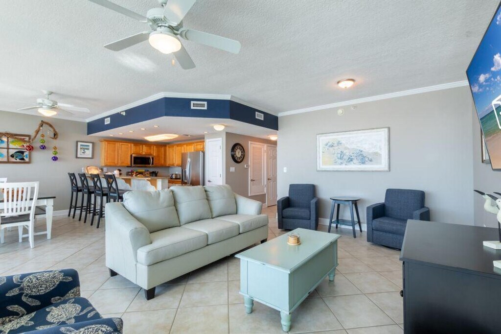 Experience the mesmerizing beauty of the Gulf Coast with this stunning 2-bedroom, 2-and-a-half-bathroom condo, just steps away from the beach. Begin each day on your private balcony, soaking up the sun on the beautiful white sand beaches. This condo offers a perfect blend of fun and relaxation, with easy access to the Little Lagoon viewpoint and a short drive to shopping and other area attractions. With a fully stocked kitchen and an on-site BBQ area, preparing meals is a breeze. The condo also features a fitness center, outdoor pool, and indoor sauna, ensuring you can keep your fitness routine on track. Enjoy the convenience of a washer and dryer, WiFi, and an entertainment system for your leisure. Paid parking is available on-site for $35 per pass with no limit. Located near Gulf Shores Public Beach, this condo provides access to miles of white sand and turquoise waters, perfect for sunbathing, swimming, and various beach activities. Nearby attractions include the Alabama Gulf Coast Zoo, Gulf State Park, Waterville USA, and The Wharf at Orange Beach, offering a variety of shopping, dining, and entertainment options. The condo has a strict no-smoking policy, with a $250 fine plus cleaning costs for violations. Quiet hours are observed from 10 pm to 8 am, with a $200 fine for violators. The condominium association enforces a strict no-pets policy, except for ADA-compliant service dogs. No parties or events are allowed, with a $500 fine for violations. A minimum age of 25 is required for check-in from March 1st to May 1st, and a state ID or driver's license is required upon booking. Security cameras are installed outside for safety, and beach towels are not provided.