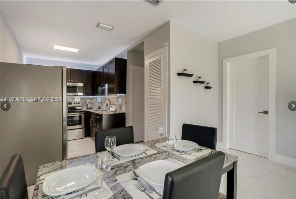 Completely remodeled and fully furnished 2-bedroom, 1-bath residence. Features a brand-new kitchen with wood cabinetry, stainless steel appliances, and exotic granite countertops. Modern bathroom with glass shower doors and built-in LED mirror. New Italian tile flooring and LED lighting throughout the home. Electrical and plumbing systems fully updated. High-efficiency 2.5-ton Rheem A/C and newer Titan water heater. Laundry room includes new washer and dryer. Partial use of outdoor storage shed and private garden space included. One assigned parking space. Side entrance. Prime location just one block from the bay and minutes from Bal Harbour Shops, beaches, Sans Souci, Biscayne Park, and surrounding areas. Available February 10th. Fast approval. No HOA. Pets OK. Fully and elegantly furnished. Rent includes water; landscaping not included.