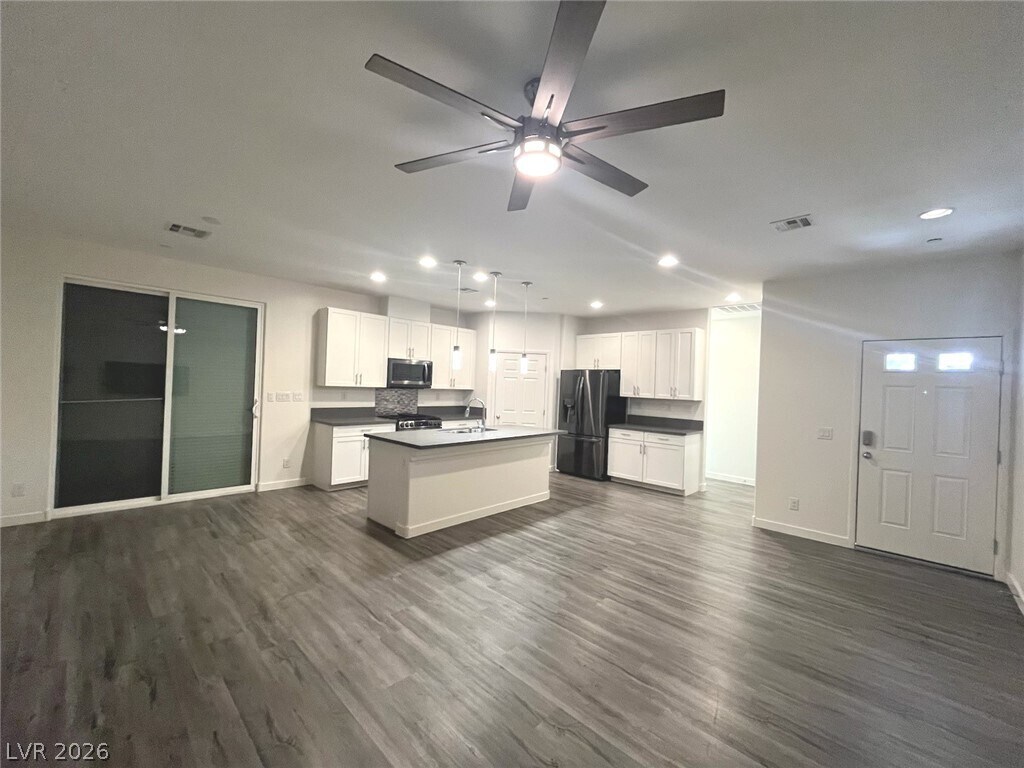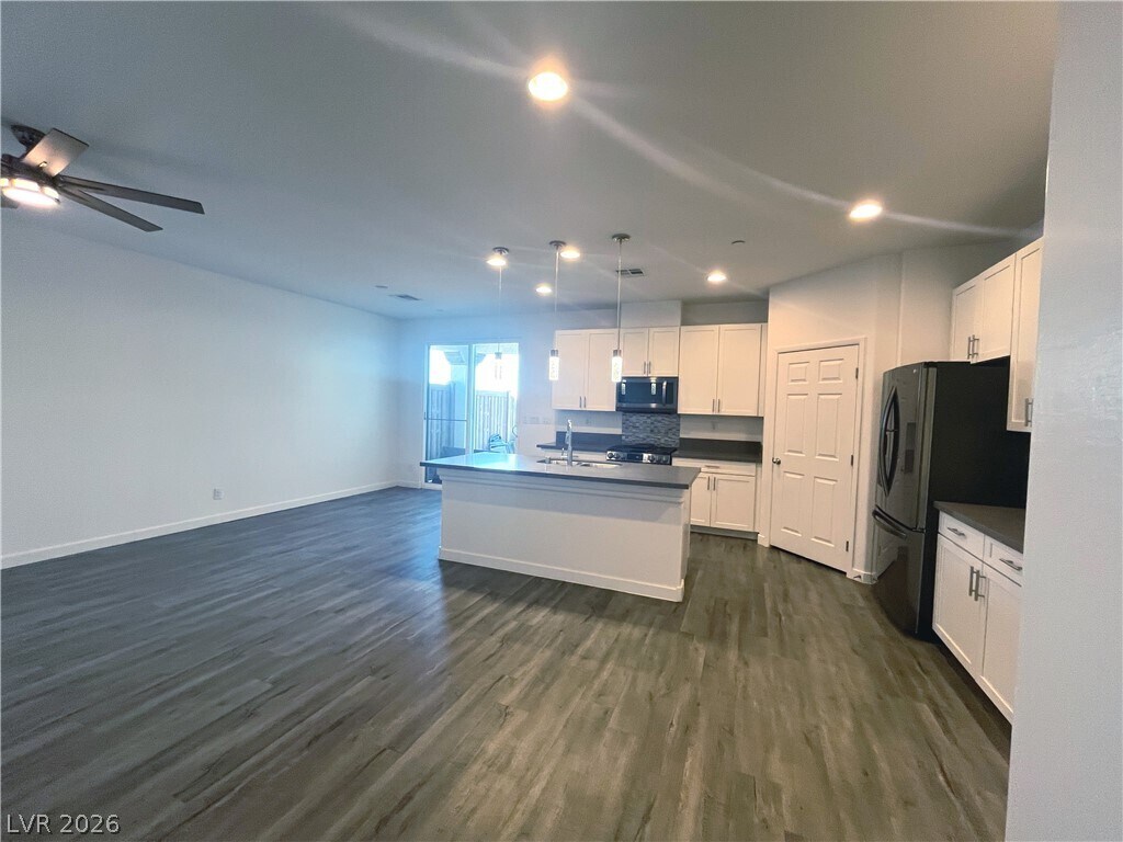 Single-story 1326 sq ft, townhome built in 2019 w/3 bed, 2 bath & spacious attached 2-car garage in beautiful Boulder City. House fully equipped with Rolladen rolling shutters for protection, security and energy efficiency & soft water system. Kitchen w/island & breakfast bar w/quartz counters, white shaker cabinets, luxury vinly plank floors, recessed lights & pendant lights, SS appliances & walk in pantry. Open concept family room w/ceiling fan & light & luxury vinyl plank floors. Primary bed w/ceiling light, luxury vinyl floors, walk in closet & slider to outside. Primary bath w/dual sinks, quartz counters, white shaker cabinets & walk in shower. Bed 2 w/ceiling light, luxury vinyl floor & closet. Bed 3 w/ceiling light, luxury vinyl floors & walk in closet. Bath 2 w/quartz counters & tub/shower combo. Laundry w/white shaker cabinets. Garage w/built in cabinets & epoxy floors. Stunning mountain and desert views. Prime location by downtown Boulder City, Lake Mead, Hoover Dam.