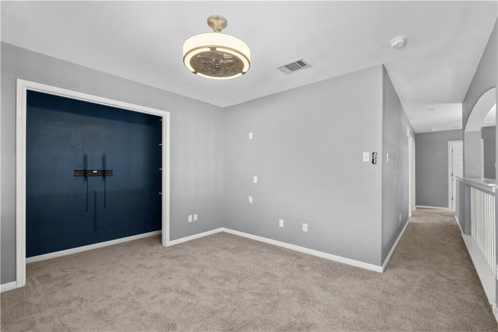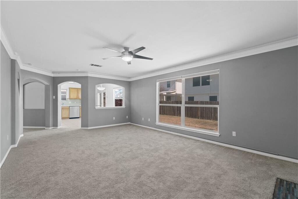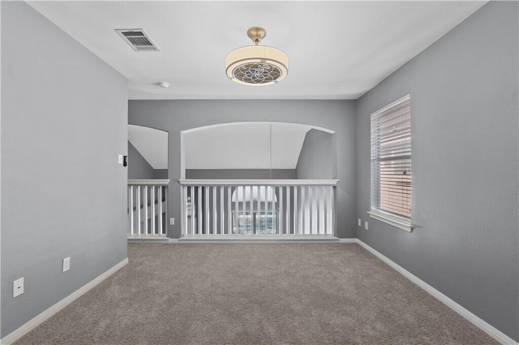 This Round Rock home is light and bright in the coveted Stoney Brook subdivision. The main level offers a soaring entry, living, and formal dining. The kitchen includes gas cooking, and a breakfast area open to the family room. A designer wall with inset fireplace provides a cozy feel to the family room that looks out to the backyard. A main level half bath - ideal for guests - is just off the laundry room. Upstairs, a flexible loft space allows for an additional living, playroom or office. Two secondary bedrooms share a full bath. The owner’s suite features his and her closets, dual vanity, garden tub and separate shower. The large backyard is surrounded by mature trees creating a private setting. Easy access to IH35 and located close to Dell, HEB, IKEA, Round Rock Outlet Mall, Scott & White Hospital, Texas State University-RR campus and dining. Turn-key property that comes with washer/dryer and refrigerator. Available for move-in Oct 1st.