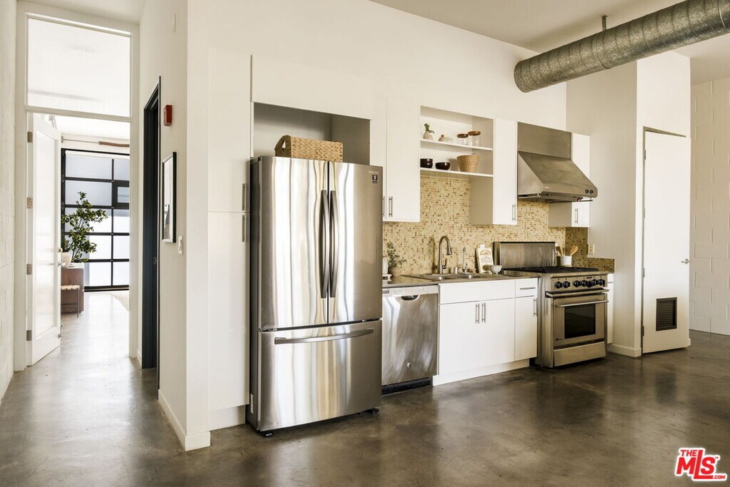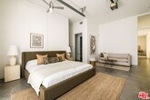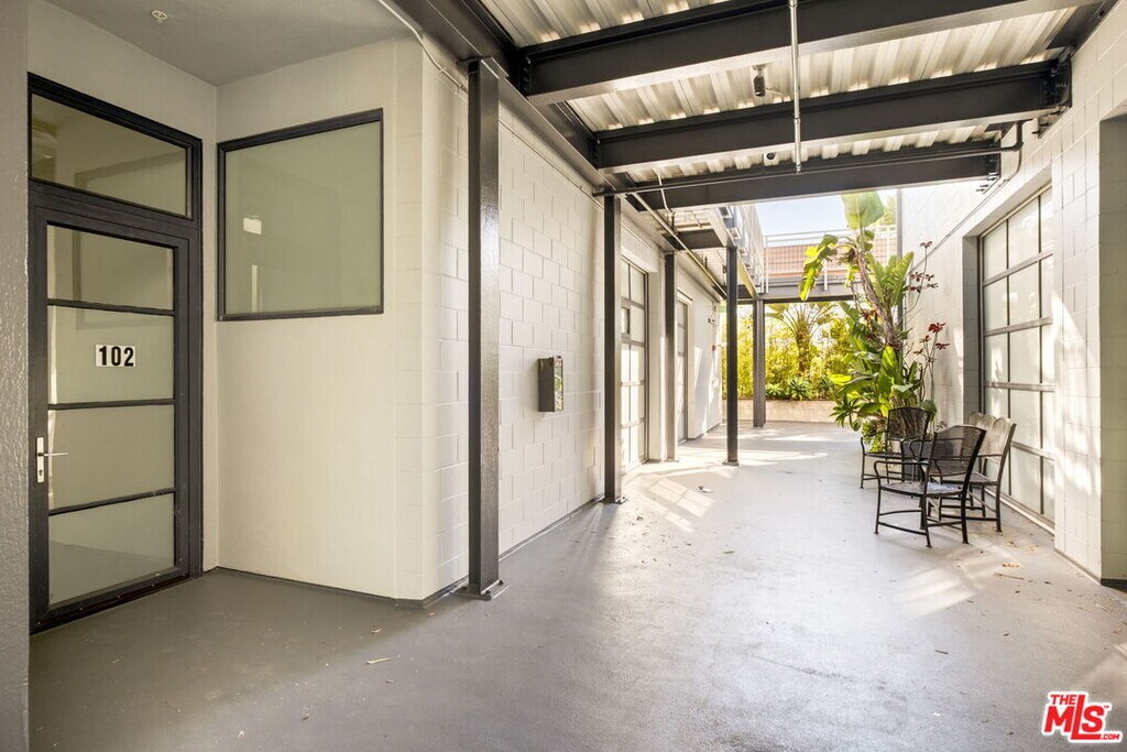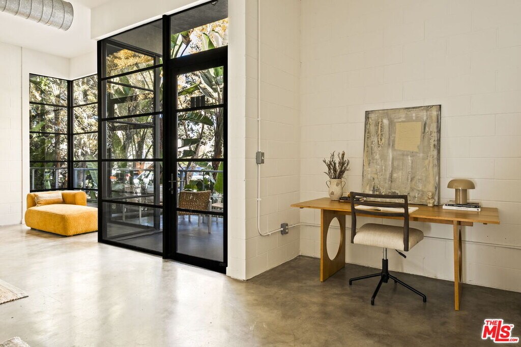 An architectural live-work loft designed by acclaimed architects Pugh + Scarpa, offering volume, character, and a modern sensibility. This ground-floor 1-bed, 2-bath residence blends industrial materials with a warm, organic palette, creating a refined setting for both living and working. The main great room opens in a dramatic sweep, with polished concrete floors, high ceilings, exposed steel, and an expansive wall of glass that frames mature greenery and soft, filtered light. Living, dining, and kitchen areas integrate seamlessly to create a multifunctional environment for everyday life, hosting, or creative work. The kitchen is efficient and well-composed, featuring stainless steel appliances, open shelving, and thoughtful storage. An east-facing patio sits just outside of the front door, extending the living space. The bedroom suite feels loft-inspired, with an operable garage-style door that introduces natural light and adds a distinctive architectural detail. The ensuite bath includes dual sinks, abundant storage, and a spacious walk-in shower. A second full bath adds guest-friendly convenience. Additional features include in-unit laundry, a storage room, and two side-by-side parking spaces with guest parking. Close to shops, dining, and the beach, this loft offers a relaxed, design-forward lifestyle with convenient access to the best of the Westside. MLS# 26645891