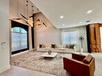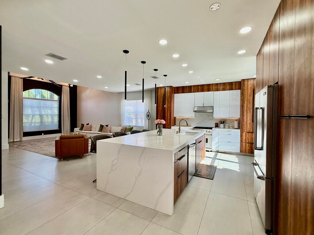 This newly renovated 4-bed, 2.5-bath home is located in a secure, family-oriented gated community. Featuring luxury finishes and modern updates throughout, this turn-key property offers both style and comfort. Inside, the kitchen is a true showstopper, boasting an oversized white quartz waterfall island with custom cabinetry, perfect for entertaining or casual dining. The kitchen is outfitted with high-end Viking appliances, including a gas stove with hood and a premium refrigerator. Additional fridge space is available in the garage. The open-concept living areas include elegant porcelain tile floors downstairs, gorgeous lighting fixtures in the living room and stairwell, and a custom-built, glass-enclosed wine rack set into the wall. The upstairs features four spacious bedrooms all