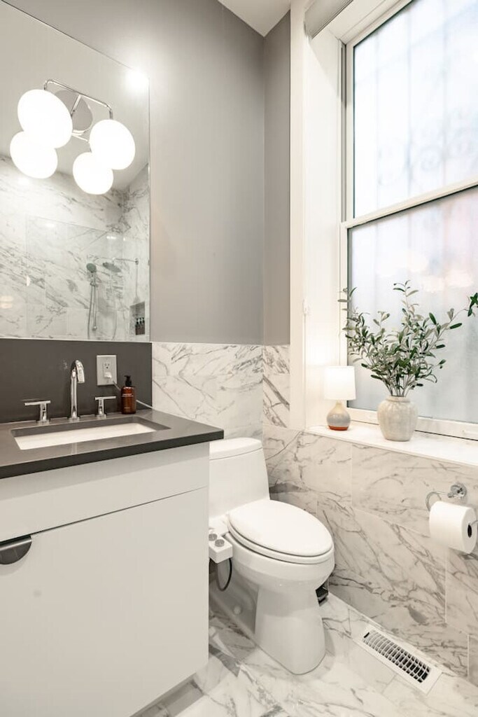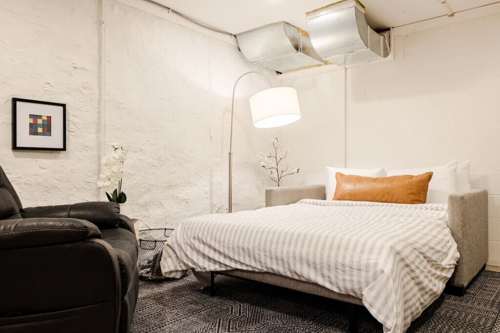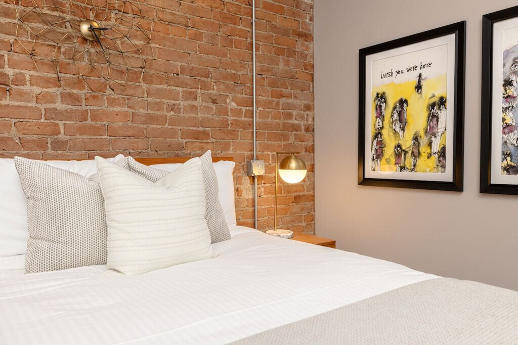 Feel at home in this gorgeous 4-bedroom townhome located just steps from Washington Park. Perfect for groups and high-level executives, this property features a gym, gated parking, EV charging for Tesla, and private en-suite bathrooms for three of the four bedrooms. Enjoy incredibly easy access to all of the city's sports stadiums, music venues, best restaurants, parks, and cafes, or hop on the Streetcar for free to explore the central business district. The space is remarkably well-designed, comfortable, and amply stocked. The first floor welcomes you with a hand-carved staircase from 1880, leading to the master and second bedrooms, both with en-suite bathrooms. The second floor boasts a spacious, bright open kitchen-living space with dining seating for up to 9 people, a luxury pull-out sofa, and upscale Kitchenaid appliances, including a Breville espresso machine. The basement level houses the fourth bedroom with a queen-sized sofa bed, doubling as an office and gym. The property offers gated parking with a dedicated spot and EV charger. Additional vehicles can park in nearby garages for $15-$20 per 24 hours. Located in the vibrant Over the Rhine neighborhood, known for its parks, walkability, restaurants, cafes, nightlife, and event venues. With a 96 Walkscore, it's a walker's paradise, offering proximity to sports stadiums, wedding venues, arts and culture spots, and more. Despite being near everything, the property is tucked away enough to avoid late-night bar noise. The area is a mixed-income neighborhood, offering a diverse urban experience. Quiet hours are from 9:30pm-8am. Parties and amplified music are strictly forbidden without advance written consent. Smoking and lighting anything indoors is not allowed, with a $300 cleaning fee for violations. Pets are not allowed, including emotional support pets. Bedroom 4 is located in a comfortable, air-conditioned basement area that doubles as the gym and office. The neighborhood is mixed-income, with a diverse urban environment. If you have questions about the neighborhood, contact us prior to booking. Includes a seated desk, workstation with guest account, and printer in the basement office area. The gym features dumbbells, an adjustable flat bench, a treadmill with a desk, and other accessories. [SI]