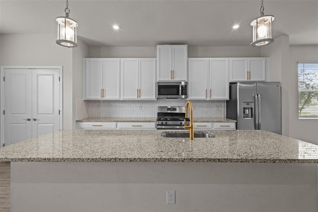 One or more photo(s) has been virtually staged. Discover this beautifully maintained end-unit townhome in the highly desirable Asturia community of Odessa. Built in 2020,this modern residence combines style,comfort,and functionality with a prime location near shops,dining,and major commuter routes. The open-concept first floor features luxury vinyl plank flooring throughout,abundant natural light from extra side windows,and a spacious living and dining area that flows seamlessly into the designer kitchen. The kitchen includes granite countertops,a tile backsplash,pendant lighting,and elegant gold accents. Stainless-steel appliances—including a natural-gas range—make cooking both enjoyable and efficient. A convenient half bath and direct courtyard access complete the main level. Upstairs,the primary suite offers a walk-in closet and private bath with dual sinks,quartz countertops,and a walk-in shower. Two additional bedrooms share a full bathroom with a tub/shower combination,ideal for guests,family,or a home office. The second-floor laundry room with washer and dryer included adds everyday convenience. Outdoor living continues in the fully fenced brick-paver courtyard—a private retreat with gate access to a side-yard area,perfect for relaxing,grilling,or entertaining. The detached 2-car garage provides secure parking and additional storage space. Residents of Asturia enjoy resort-style amenities including a clubhouse,fitness center,resort-style pool,playground,dog park,and scenic walking and biking trails. The HOA also maintains exterior landscaping for a low-maintenance lifestyle,allowing residents to enjoy all that the community has to offer. Asturia’s location offers unbeatable convenience—just 0.2 miles to the community clubhouse and fitness center,1.8 miles to the Suncoast Trail,1.6 miles to Publix and Starbucks at SR-54,and quick access to the Suncoast Parkway for an easy commute to Tampa,the Gulf beaches,and surrounding areas. View the virtual tour link to see the full video walkthrough of this home. This property is also available for purchase,offering flexibility for those looking to rent now and explore ownership in the future. Tenant is responsible for all utilities including trash,cable,water,electric,and gas. Rent includes HOA and CDD fees,which are paid by the owner. MLS# TB8443575