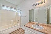 Welcome to this beautiful two-story, four-bedroom home offering space, style, and comfort throughout. An attached two-car garage provides convenient direct entry. The inviting front living room features tile flooring and soaring ceilings that create a bright, open feel. The spacious kitchen is designed for everyday living and entertaining, complete with custom cabinetry, a center island, recessed lighting, and tile countertops. One bedroom is conveniently located downstairs and includes a ceiling fan/light and laminate wood flooring—ideal for guests or a home office. Upstairs, you’ll find an open loft perfect for a media or study area. The expansive primary suite showcases vaulted ceilings, abundant natural light, laminate wood flooring, and a ceiling fan. The en-suite bath offers dual sinks, a large soaking tub, and a separate shower. A secondary bedroom features private balcony access. This home is truly a must see!