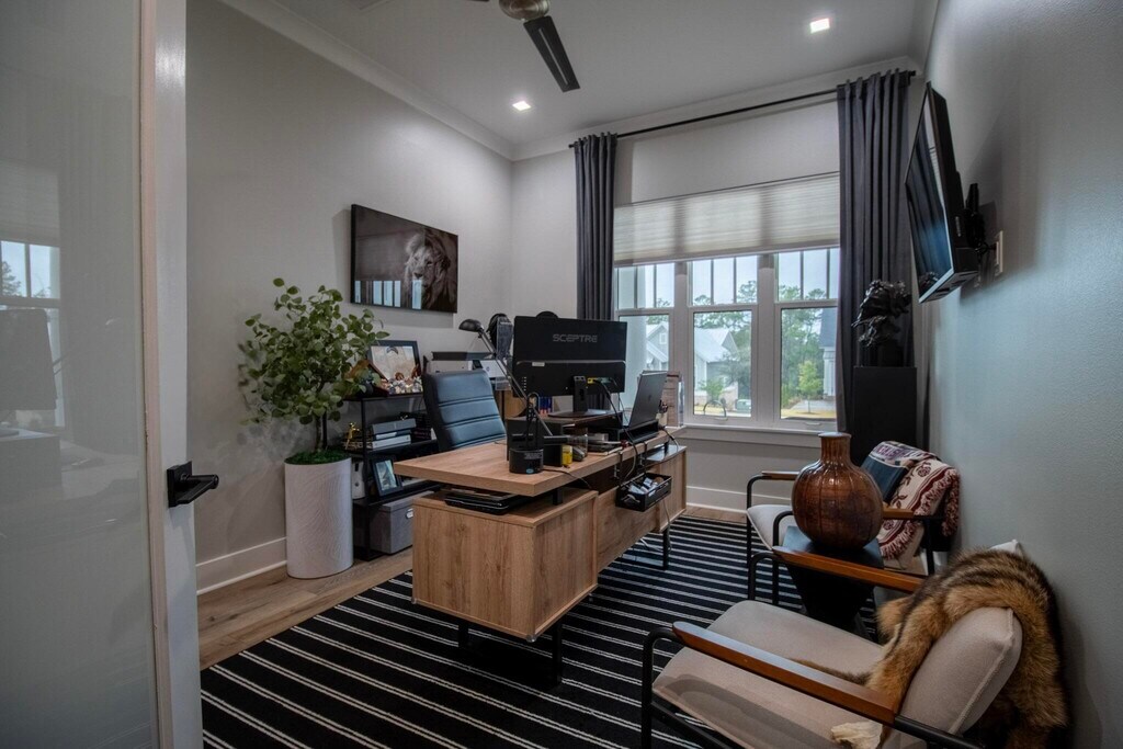 Deer Moss Creek is the place to be!! Welcome home to this three-bedroom, two-bath luxury residence in the vibrant & exciting Deer Moss Creek community of Niceville. Built just a few short years ago, this thoughtfully designed single-family home blends modern elegance with everyday functionality. Curb appeal shines with manicured landscaping, an inviting front porch, and designer exterior shutters. Inside, you're greeted by tall ceilings, abundant natural light, and a private home office with a door, perfect for remote work or quiet retreat. The open-concept living and kitchen area is anchored by an electric fireplace with shiplap surround, creating a warm yet contemporary focal point. The chef's kitchen is beautifully appointed with sleek white cabinetry, stone countertops, stainless