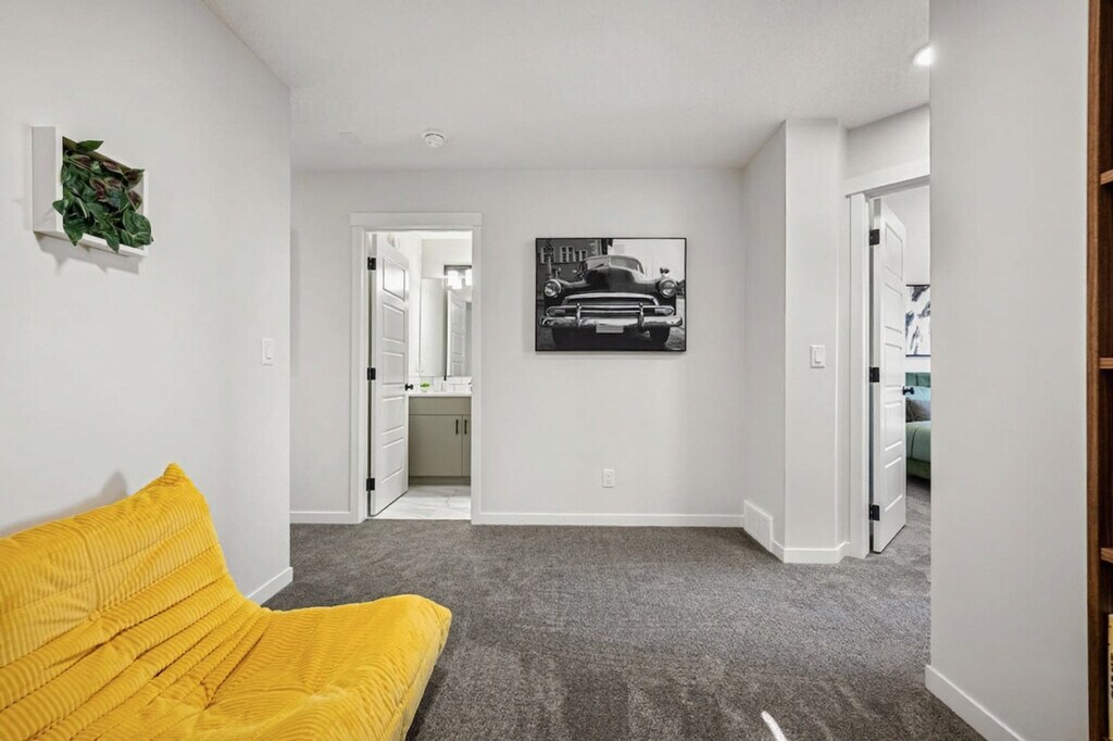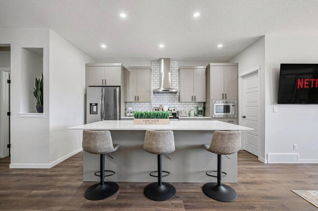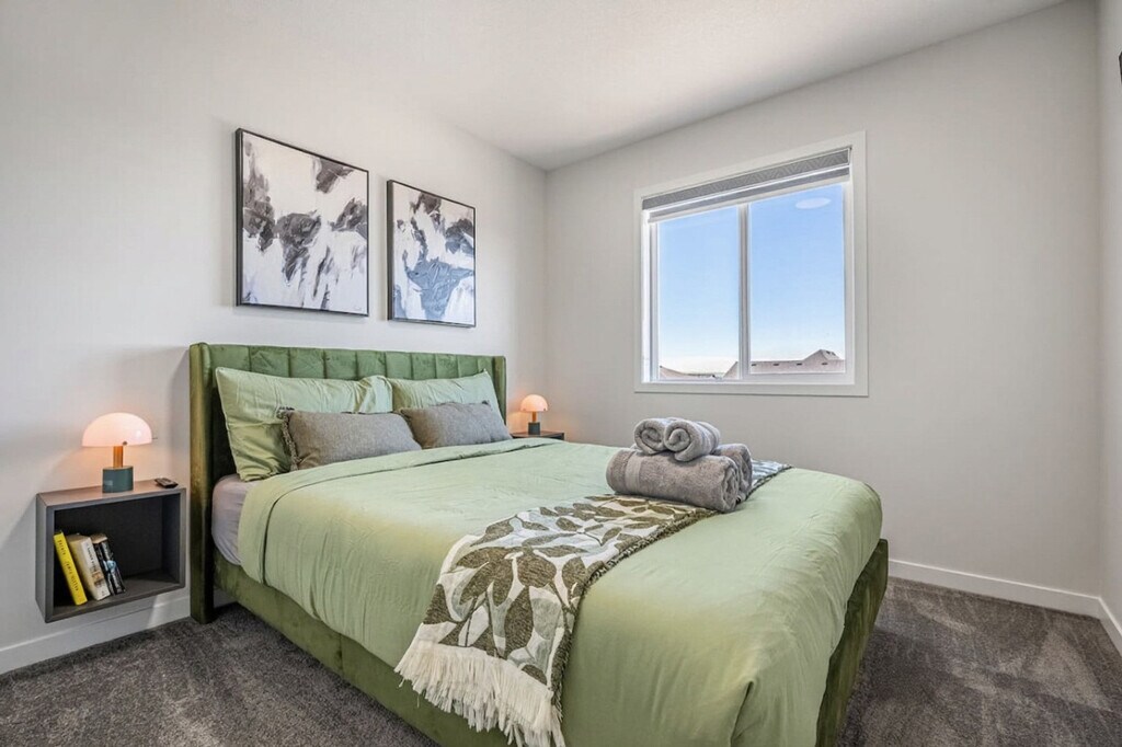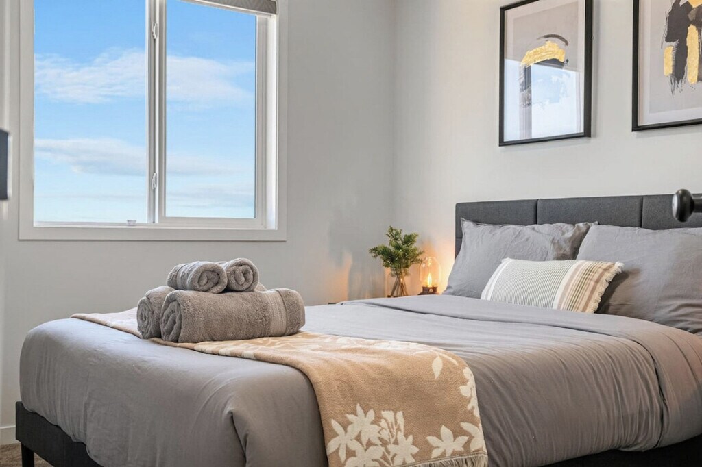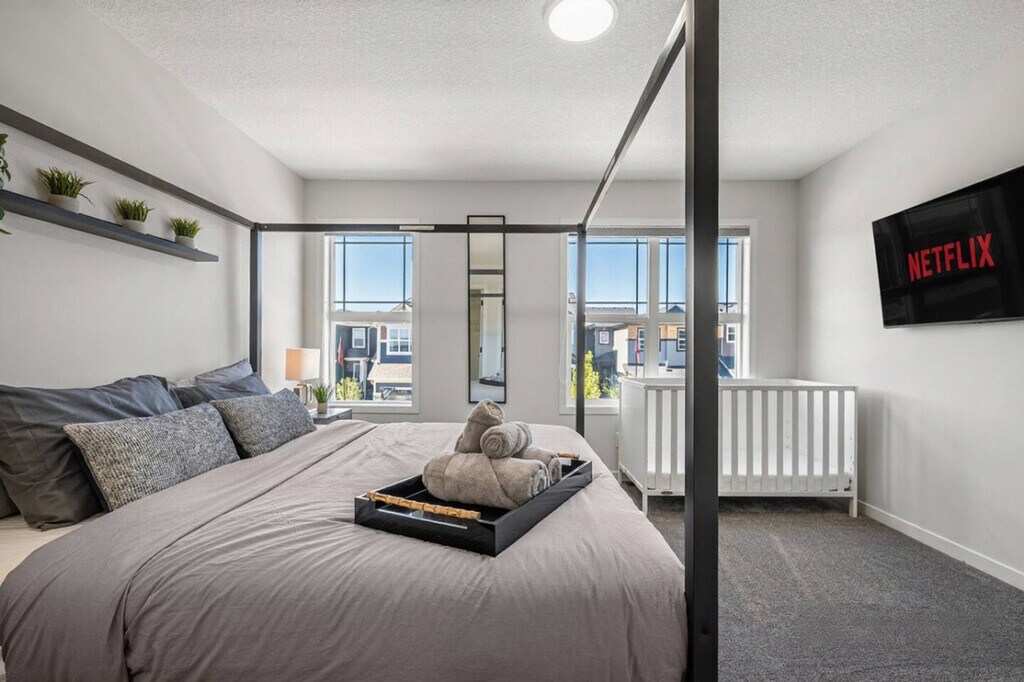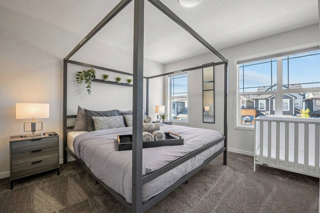 Welcome to a luxurious retreat in Glacier Ridge, nestled in a safe and family-friendly neighborhood just off Shaganappi Trail, minutes from the airport. This spacious home comfortably sleeps up to 10 guests and features four bedrooms with a king-size bed and three queen beds, along with two single bed cots. Enjoy the comfort of central heating and AC, a fully stocked kitchen, and a living room equipped with a 65" smart TV. The apartment boasts a modern and inviting living room with a comfortable sofa and high-speed Wi-Fi, perfect for relaxation or entertainment. The kitchen is a chef's dream, equipped with stainless steel and custom appliances, including two 4-burner stoves, an oven, and a microwave. Enjoy meals in the large dining area on the main floor or the additional dining space in the basement living room. Complimentary tea, coffee, and essentials are provided for your convenience. Enhance your stay with optional upgrades such as a National Park Entry, Welcome Basket, Birthday Decor Package, Romantic Wine and Flower Package, Spa at Home Package, Movie Night Upgrade, Christmas Tree and Decor, Halloween Decor and Pumpkin Carving Package, Winter Cozy Package, Beer Tasting Kit, Diffuser and Aroma Set, Additional Bedding and Sleeping Arrangements, Grocery Pre-Stocking Service, and a Pet Friendly Package. These are subject to availability. Located in Glacier Ridge, this home offers easy access to Calgary's top attractions. Just a minute away from Glacier Ridge Playground and Walking Trails, and within a short drive to Stoney Trail and Shaganappi Trail for quick city access. Enjoy nearby amenities like McDonald's, Tim Hortons, No Frills, and local shopping. The property is also conveniently located 18 minutes from Calgary International Airport and 20 minutes from downtown Calgary, offering a seamless travel experience. This property is professionally managed to ensure a smooth and enjoyable stay, with 24/7 guest support and communication. Self check-in and check-out are available, and detailed instructions are provided for a seamless experience. Please be aware of the no-smoking policy, with a $250 CAD fine for violations. Quiet hours are from 10 pm to 7 am, and no parties, drugs, excessive drinking, or loud music are allowed. Unauthorized late check-out will result in additional fees. Guests are responsible for any damage to linens, towels, utilities, or equipment upon check-out, and fees may apply for excess garbage disposal. A simple pre-arrival form, ID verification, and agreement may be required before check-in. Please follow city guides on garbage, recycling, and composting to avoid fines. The home includes an office work area, making it ideal for remote work. High-speed Wi-Fi ensures a seamless connection for all your professional needs. [SI]