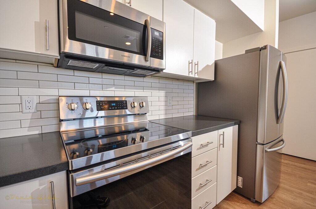 Entering this ground-floor flat the spacious open living area is accentuated by its floor to ceiling windows, impressive nine-foot ceilings and striking plank flooring throughout. Easy flow from the living and dining areas lead one into a contemporary and efficient kitchen with state of the art stainless steel appliances, upgraded sinks and faucets, installed microwave. A washer and dryer are tastefully behind closet doors in the flat's single hallway. Going further there are two alluring bedrooms: a "master" bedroom with its own full bath boasting a large shower as well as an ample custom-designed walk-in closet. An equally roomy second bedroom has a guest bathroom across the hallway. With 1033 square feet to move about inside, this flat also features views of the lovely Stewart Meadows Village pool and community center. Flats come with available parking located nearby for safe and convenient access. Water, sewer, garbage and wi-fi included. Tenants to pay electricity & $75 monthly amenities fee. One-year lease term required. This is a non-smoking complex. This building is pet friendly with $500 pet deposit and $25 monthly pet rent. Rental applications can be found at Photos in this listing are representative.