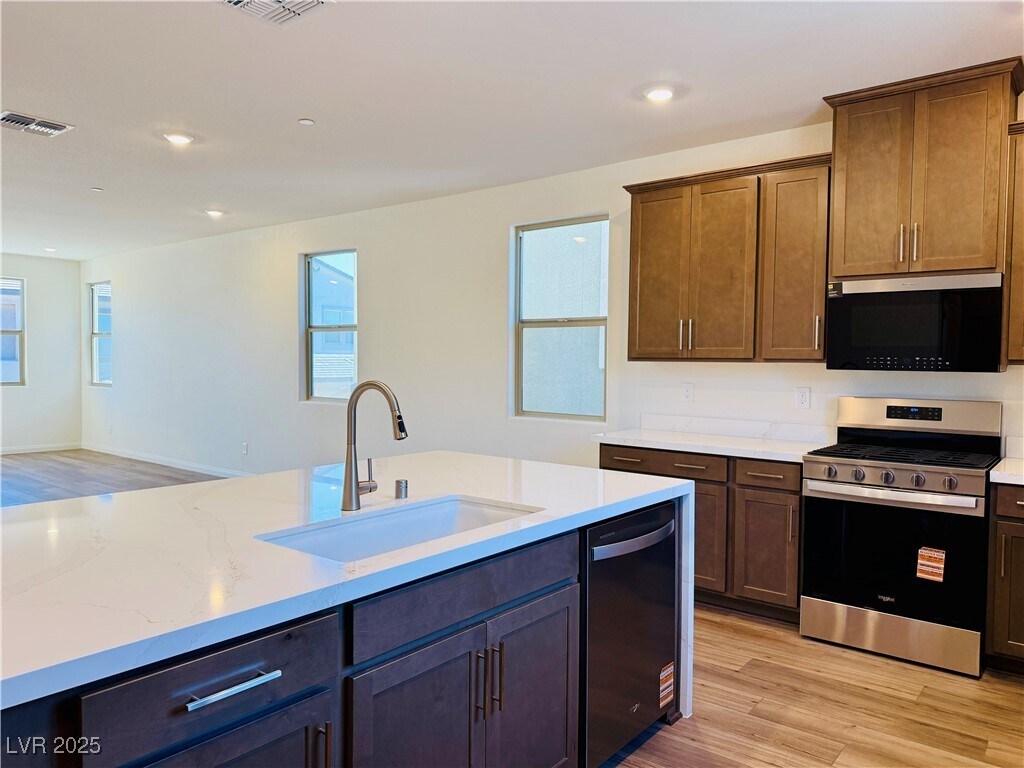 Newly built three-story home in Kestrel Commons! This modern residence features a private junior suite on the first floor, perfect for guests or multigenerational living. The kitchen showcases 42 maple cabinets and stunning Calacatta Alabaster countertops with a waterfall edge. Enjoy a full driveway—rare for the area—and luxury vinyl plank flooring throughout the second floor and all wet areas. The open, airy floorplan brings in abundant natural light, creating a bright and welcoming space."