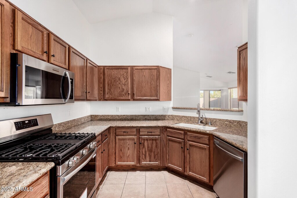 Charming single-level residence in the desirable Rancho Gabriela! This 3BR home welcomes you with great curb appeal,a meticulously landscaped front yard,a 2-car garage,and a cozy porchperfect for enjoying your morning coffee. Step through the custom entry door into a spacious great room featuring soaring vaulted ceilings and effortlessly connecting to the backyard. The kitchen boasts SS appliances,granite countertops,and abundant cabinetry. The split owner's suite offers privacy & comfort,complete with an ensuite bathroom. Outdoors,a wrap-around covered patio overlooks lush green grass,providing an inviting space for relaxation or gatherings. Near schools,dining,and shopping,with quick access to AZ-303,AZ-60,and Northern Parkway. Don't miss out!