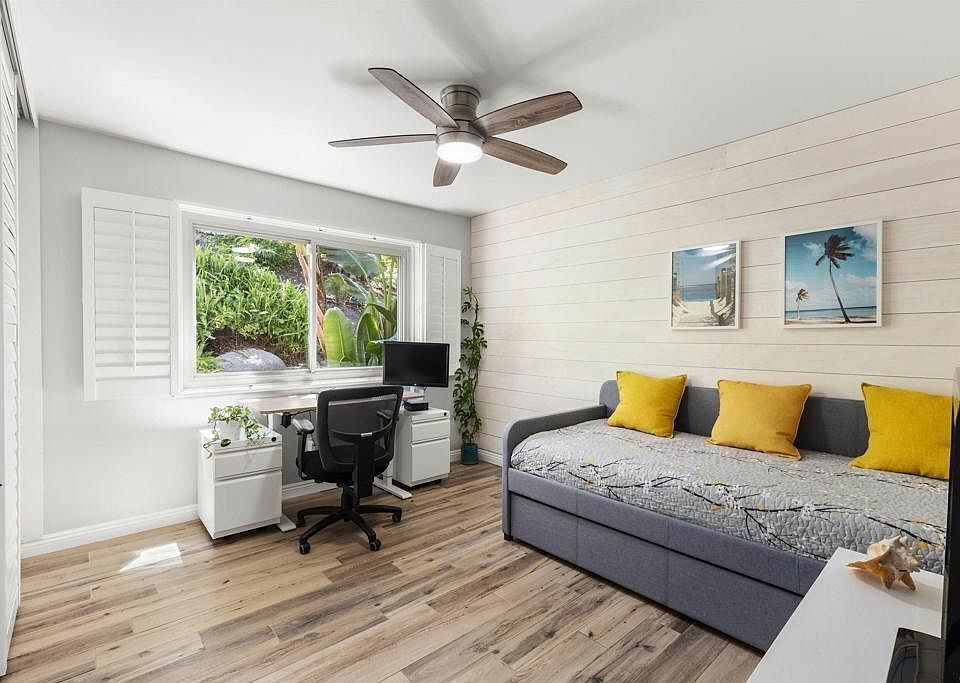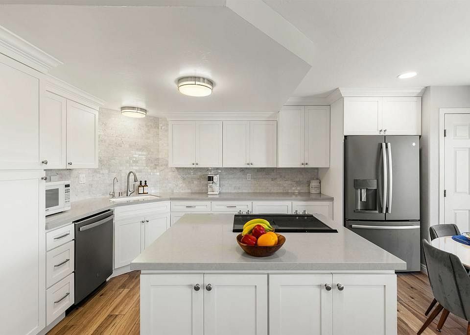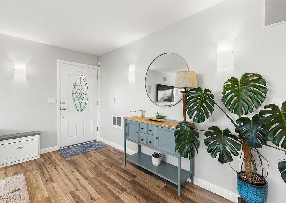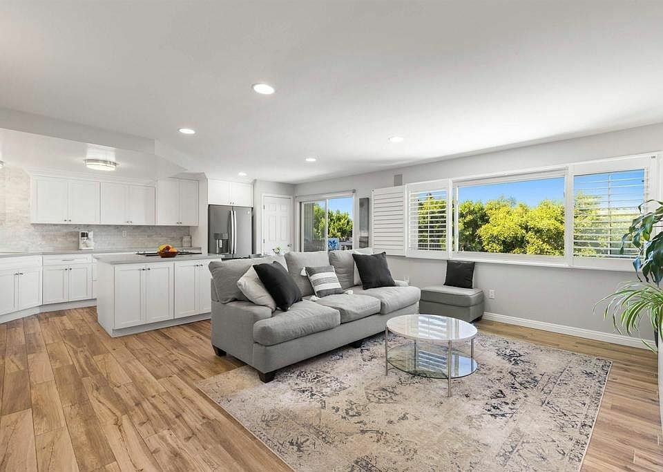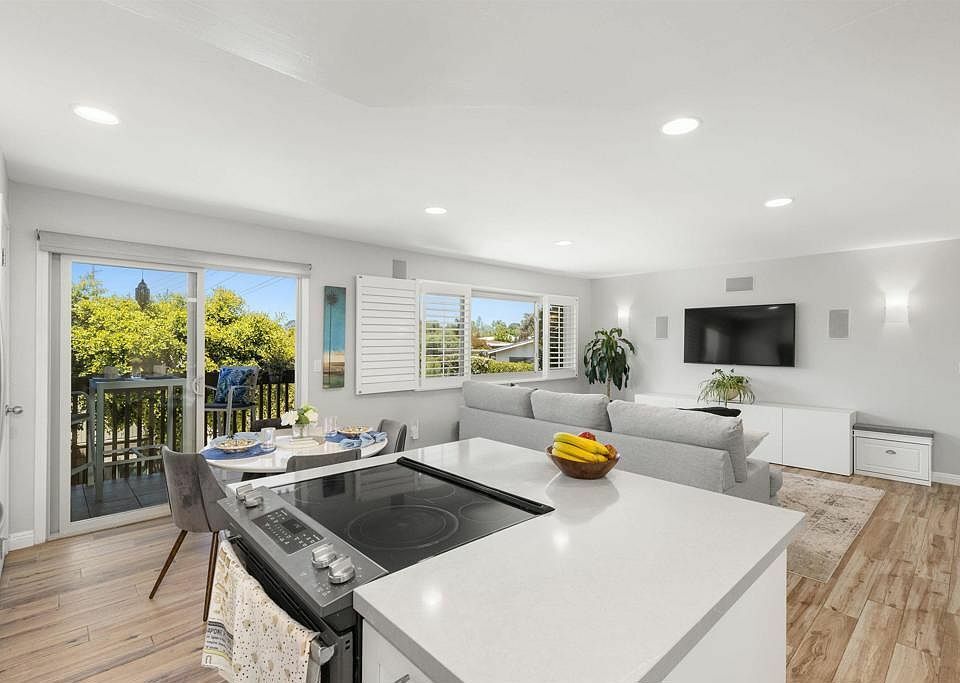 Gorgeous Inside, with a tropical retreat outside to have a quiet moment. Discover this stunning corner end-unit in Encinitas, short walk to Moonlight Beach, offering breathtaking horizon ocean views. Recently remodeled, the home features a modern kitchen with quartz countertops, stainless-steel appliances, soft close doors/drawers, a remote control sunshade, and reverse osmosis filtration system. Enjoy dual-pane windows with plantation shutters, custom paint, wood-like flooring, and a wide-open patio with ocean breezes. Bedrooms overlook lush greenery, ensuring privacy with no neighboring units behind. Additional amenities include in-unit laundry, dedicated covered parking, and location within the award-winning San Dieguito School District.