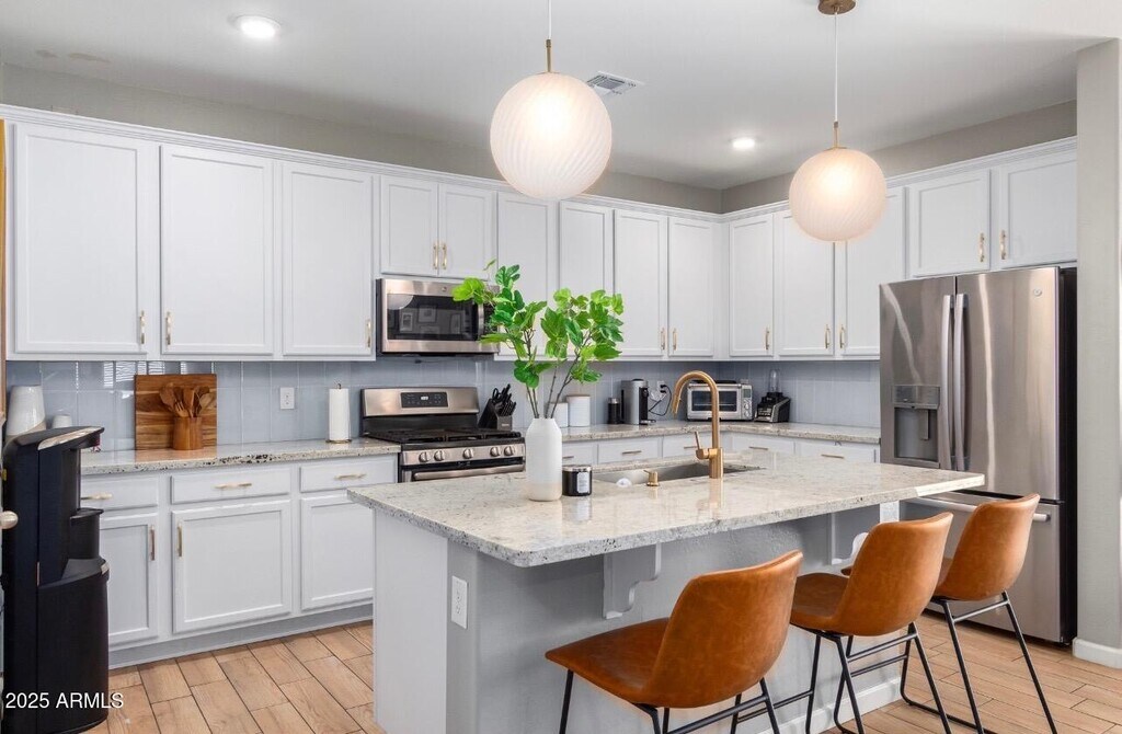 Adorable Villago Home Now Available! This charming home offers excellent curb appeal,a 2-car garage,and a low-maintenance landscape. Step inside to a delightful interior featuring wood-look tile flooring,a soothing neutral palette,recessed lighting,and a formal dining area accented by a stylish chandelier. The spacious great room,complete with backyard access,is perfect for entertaining or relaxing. The immaculate white kitchen shines with ample shaker cabinetry,granite countertops,stainless steel appliances,a pantry,and a large island with a breakfast bar. Unwind in the primary suite showcasing a handsome accent wall,walk-in closet,and a pristine ensuite with dual sinks. Enjoy outdoor living under the cozy covered patio overlooking a sizable backyard with turf.