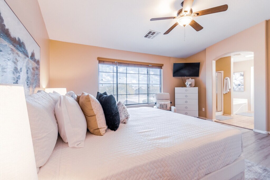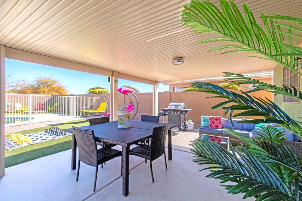 The advertised rate of $5,135/month is the lowest available price, based on a 30 day(s) stay with a move-in date of May 29, 2026. Rates vary depending on the duration of stay, season, and other parameters. For exact pricing and additional pricing components, please visit our website and enter your desired move-in and move-out dates. The rate is applicable when billed upfront; it can be higher if billed in multiple payments. Feel at home in this modern 4-bedroom Casa Grande home, perfect for long-stay guests. Designed for comfort, productivity, and extended stays, this single-level home offers quiet surroundings with easy access to major employers, shopping, dining, and I-10. This spacious home features a private heated pool, a king-size suite with a spa bathroom, fast Wi-Fi, a full laundry room, and a fully stocked kitchen. The kitchen is equipped with stainless-steel appliances, a Keurig and drip coffee maker, full cookware and bakeware, oil, salt, pepper, spices, a toaster, kettle, blender, wine glasses, full dishware, and children’s plates and cups. Enjoy comfortable living areas with a smart TV, a grand piano, an air hockey table, a foosball table, board games, kids’ activities, a dedicated work desk with outlets, central AC and heating, and books for all ages. The pool heater is available for an additional $50 per night for guests who wish to enjoy a warm and relaxing swim. This home is centrally located near major employers such as Lucid Motors (15 minutes), Banner Casa Grande Medical Center (10 minutes), Abbott Nutrition (12 minutes), Frito-Lay Distribution (12 minutes), Kohler Manufacturing (14 minutes), and Tractor Supply Distribution Center (15 minutes). Groceries and shopping are conveniently close, with the Promenade at Casa Grande (10 minutes), Walmart Supercenter (7 minutes), Fry’s (6 minutes), and Safeway (10 minutes) nearby. A variety of restaurants are within 5–12 minutes, including Big House Café, Anaya’s Mexican, BeDillon’s Restaurant, Hideout Steakhouse, Yard House, Dutch Bros Coffee, and Starbucks. Local attractions include Casa Grande Ruins (25 minutes), Neon Sign Park (15 minutes), desert hiking trails (5–15 minutes), and Francisco Grande Golf Course (10 minutes). The backyard retreat includes a fire pit lounge, a charcoal BBQ grill, an outdoor dining space, shade and ambient evening lighting, life-size chess, a fully fenced yard for privacy, and sun loungers. For safety and convenience, the home has a keyless smart lock, smoke and CO detectors, a fire extinguisher, and a first aid kit. Free on-site parking is available for multiple vehicles in this quiet, family-friendly neighborhood. [SI]