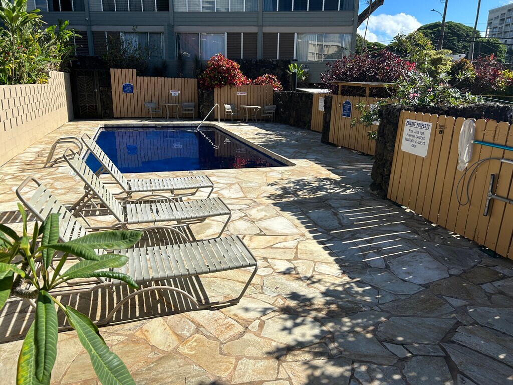 Beautifully renovated and clean 360 sq ft. studio in popular Punahou Gardens condominium. Great location near University of Hawaii, Ala Moana Shopping Center, Punahou School, Maryknoll School, and Kapiolani Hospital. Renovations included quartz counters, luxury vinyl flooring, ceiling fan, tiled shower, sliding mirror doors, black out drapes, and microwave. Water, electricity and gas are included. Secured building with community laundry room and salt water pool. No pets or smoking. Maximum 2 people. Monthly rent is $1700 includes GET taxes. Please call (leave message.) Parking is additional $80 payable to the AOAO, subject to availability.