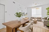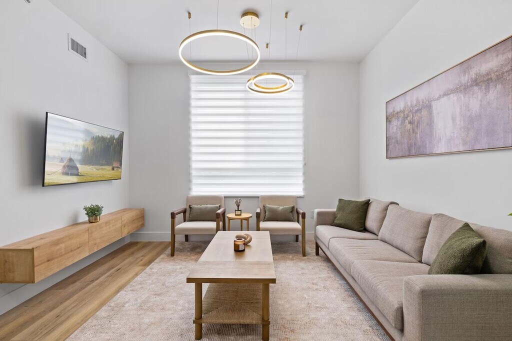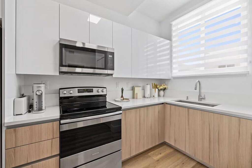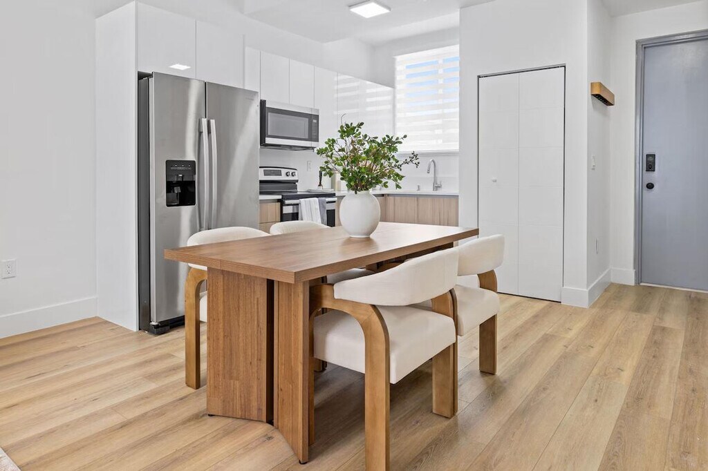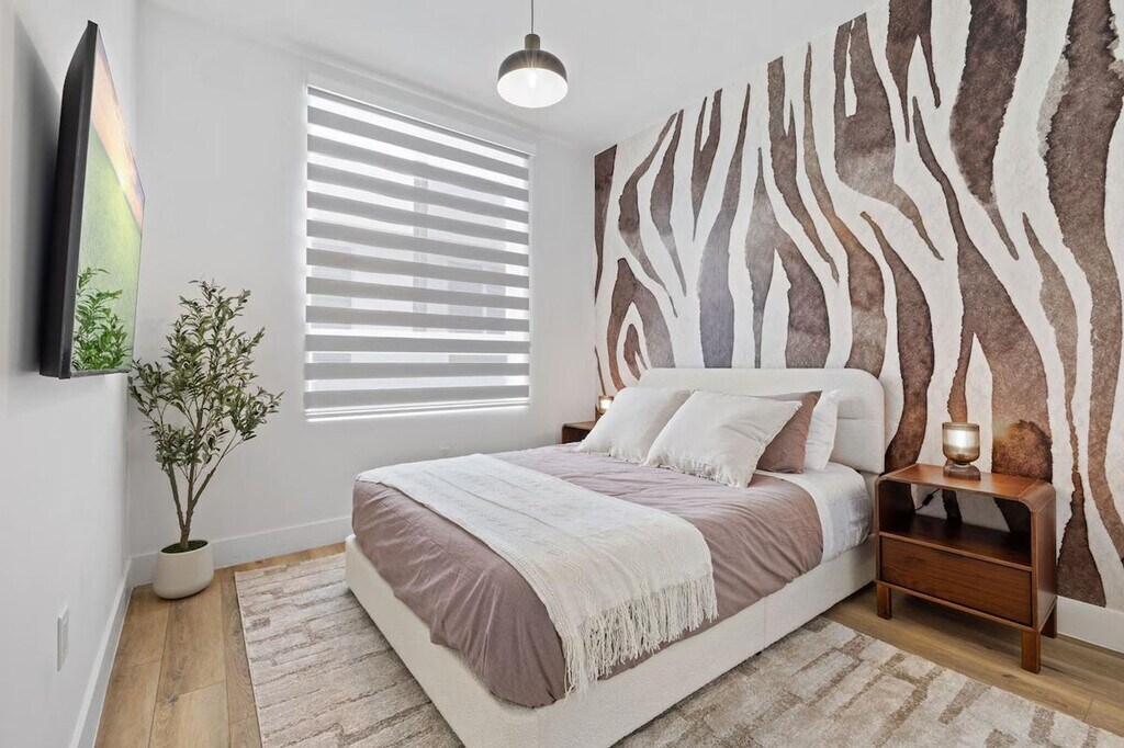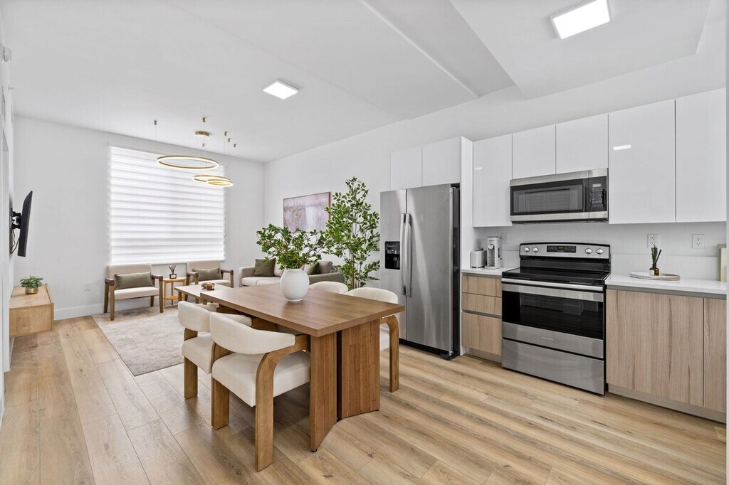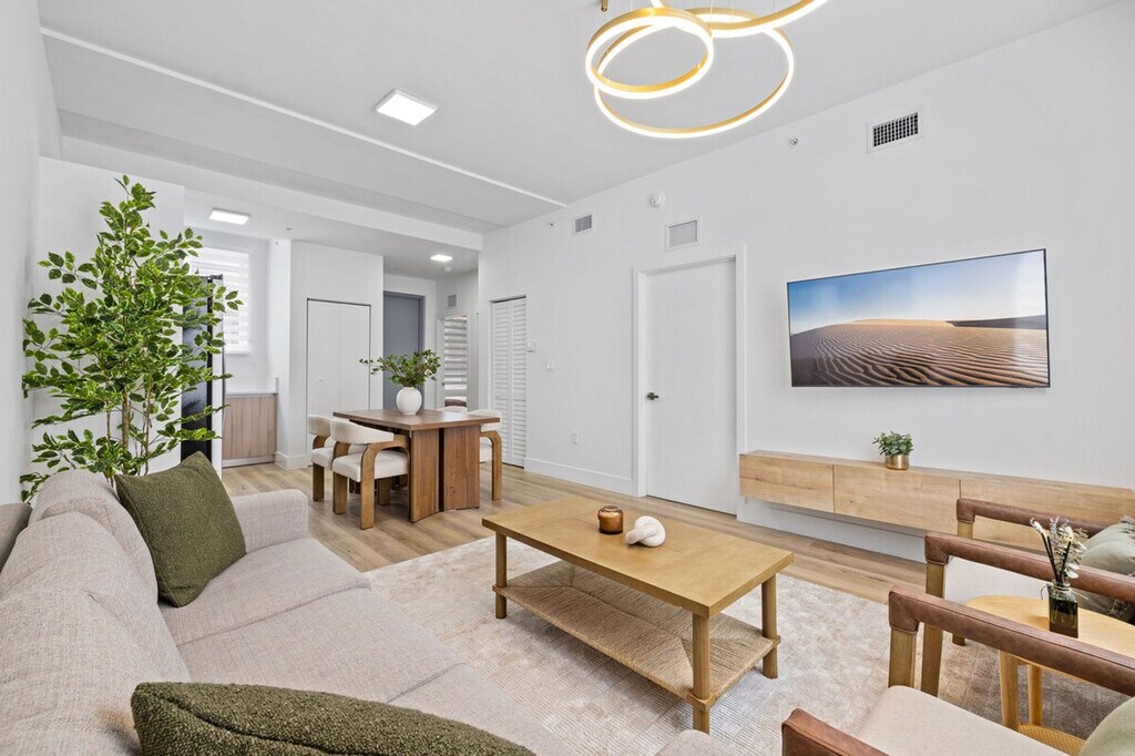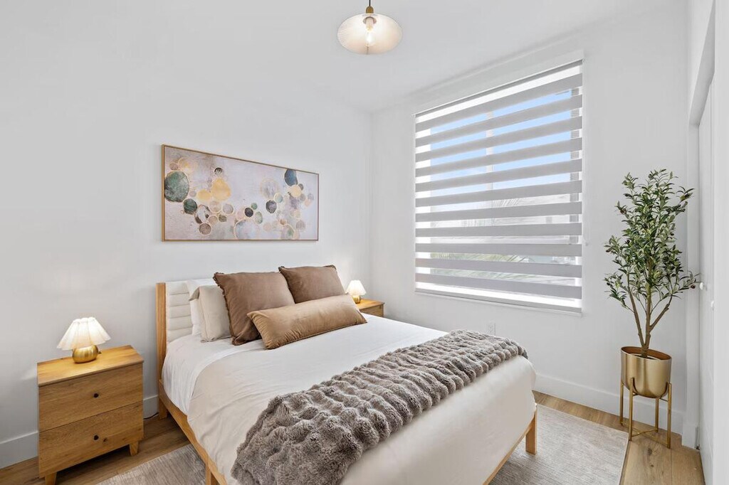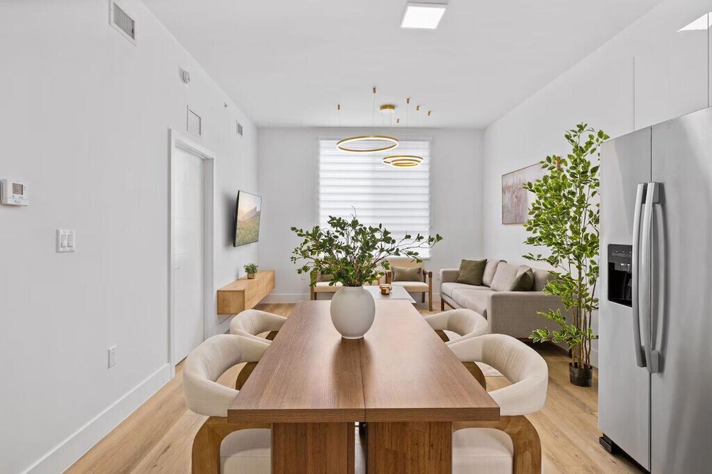 Feel at home in this newly built 2-bedroom, 2-bathroom apartment near Brickell, Downtown, hospitals, and Marlins Stadium. This townhouse-style apartment is on the second floor of a building without an elevator. Enjoy fully furnished interiors, a modern kitchen with stainless steel appliances, an in-unit washer and dryer, and high-speed Wi-Fi. The open living area features a Smart TV and flows into a large, fully built-out kitchen and dining area. The two queen bedrooms include quality linens, blackout shades, and ample storage. There are two spotless bathrooms, one with a tub and shower and one with just a shower, and a stacked washer/dryer tucked away for your convenience. All essential supplies you need to get settled down, cook, and clean are provided. Free street parking is available. This apartment is ideally located in a vibrant area, just a 2-minute walk to the nearest grocery, 5 minutes to hospitals, and a block away from Marlins Stadium. No smoking, no parties, and quiet hours are observed from 11 pm to 7 am. An exterior security camera is located on the entrance; there are none inside the unit. [SI]