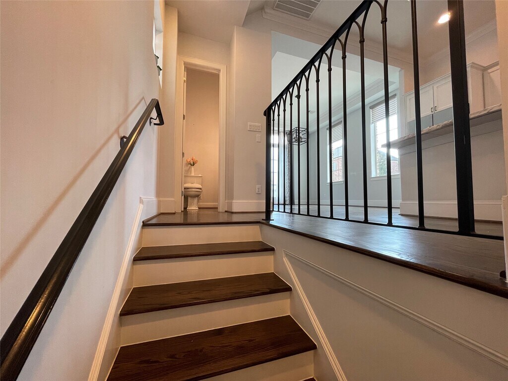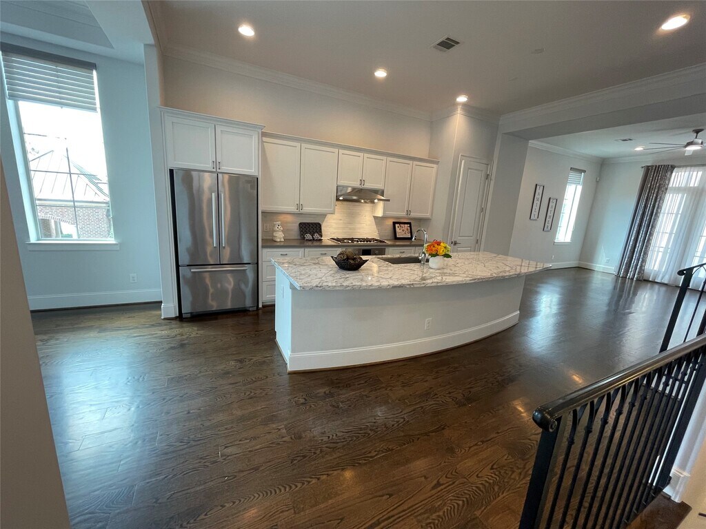 A beautiful home in the gated Lakepointe Commons. With breathtaking water views,and conveniently located near hospitals,restaurants,shopping,and freeway. 3 bedrooms 3 1/2 baths. Hardwood floors throughout most of the home,iron railing,quartz island countertop with stainless steel appliances,including refrigerator. Each bedroom has its own bathroom. Located across the street from the pool. Covered patio with fenced backyard. MLS# 6890068