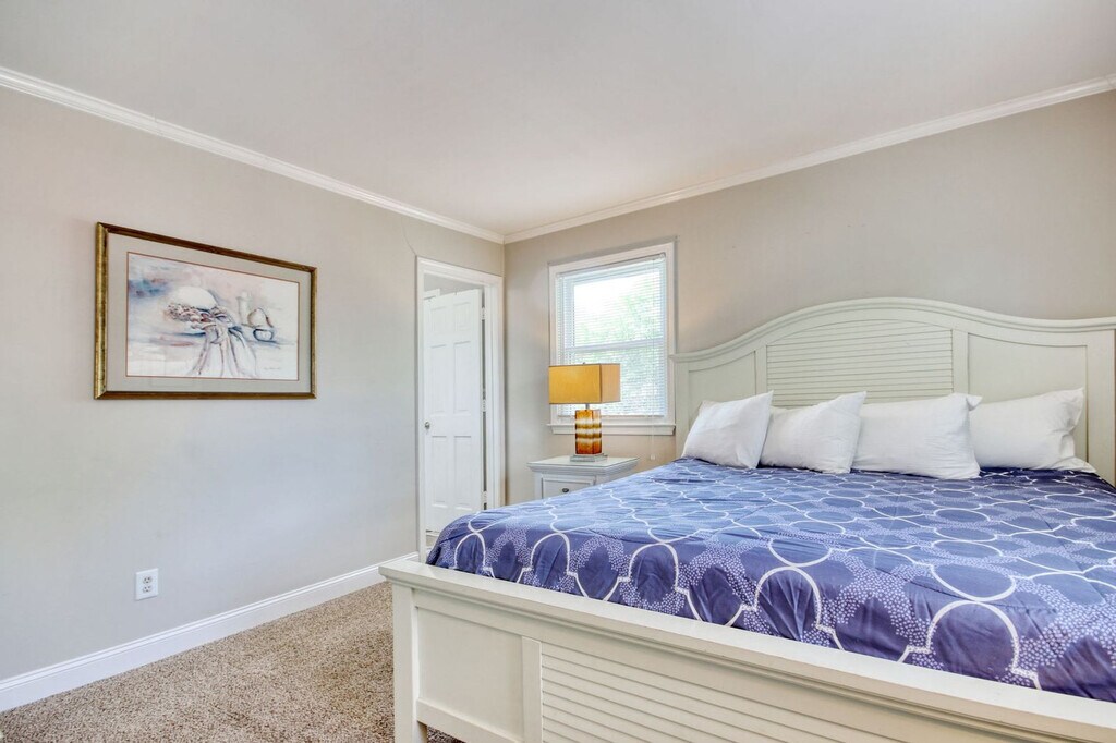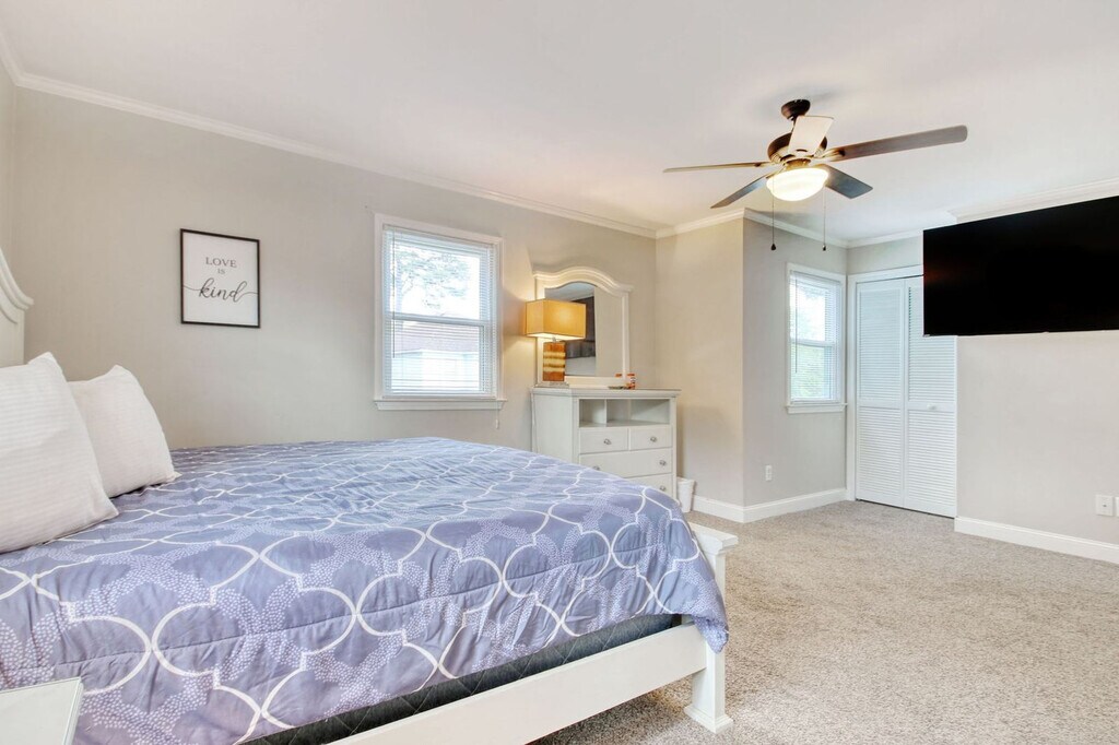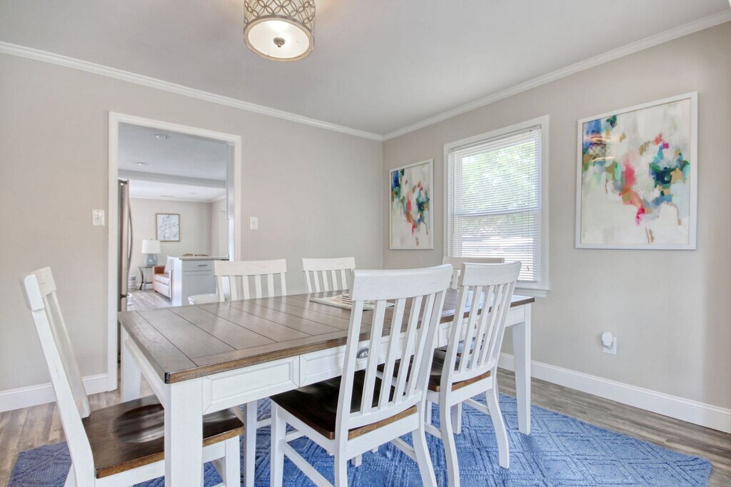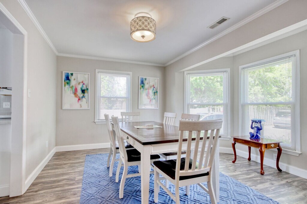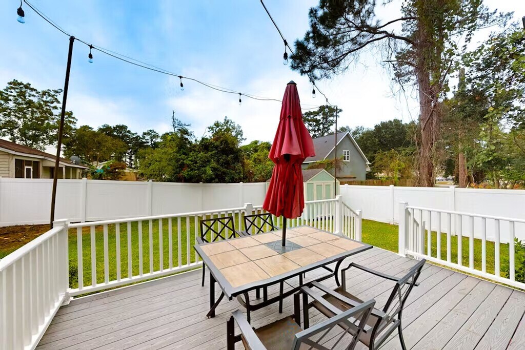 Feel at home in this Myrtle Beach home, designed for both indoor and outdoor enjoyment. This home features a tastefully decorated living space, a full kitchen, and a separate dining area with bay windows. The open layout combines a cozy living room, a dining area, and a fully equipped kitchen. The kitchen is equipped with a microwave, stove and oven, refrigerator/freezer, coffee maker, sink with hot and cold water, glassware, silverware, pots and pans, cooking utensils, and a toaster. This home also features a deck with a dining table, an oversized umbrella, cornhole boards, a gas grill, central AC, and a private washer/dryer. Free parking is available for two cars. Nestled in the heart of Myrtle Beach, this home offers the perfect balance of excitement and relaxation. It's steps from the beach and within walking distance of Broadway at the Beach, a top destination for shopping, dining, and entertainment. The Myrtle Beach Boardwalk and Sky Wheel are a short drive away, offering a vibrant scene with restaurants, bars, and attractions. For upscale shopping and unique dining experiences, explore The Market Common nearby. Nearby dining options include Sea Captain’s House, River City Café, Flamingo Grill, Croissants Bistro & Bakery, and Flying Fish Public Market & Grill. Pets are not allowed per HOA rules, but service animals in compliance with ADA guidelines are accepted. Smoking is strictly prohibited, both inside the home and on the balcony, and violations will result in a minimum $250 fee. Check-in is at 4:00 PM and check-out is at 10:00 AM. [SI]