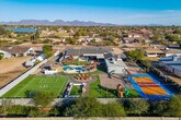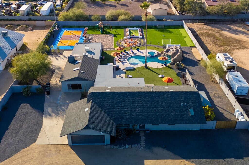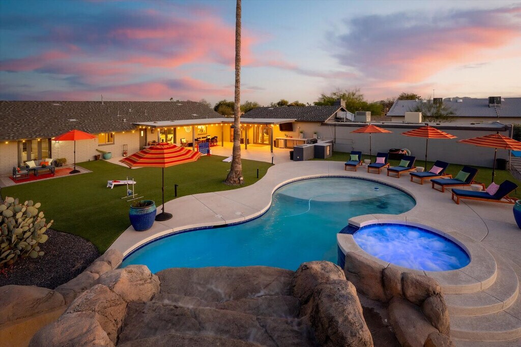 Feel at home in this 5-bedroom Phoenix getaway, a stunning retreat designed for luxury, entertainment, and relaxation. Accommodating up to 20 guests, this home includes a 4-bedroom, 2-bath main house and a private 1-bedroom, 1-bath casita, offering the perfect blend of space and privacy. This home features a fully stocked chef’s kitchen with high-end stainless appliances, ample cabinetry, and a large island with high seating, as well as a drip and Keurig coffee maker. The living room includes a 70" smart TV and a large plush sofa. Enjoy the insane private backyard resort, complete with a heated pool with a rock waterfall and slide, an in-ground spa, pickleball and basketball courts, a mini turf soccer field, a 9-hole putt-putt, snookball, a playground, an outdoor kitchen with a TV, a fire pit, a BBQ grill, cornhole, and poolside loungers. For families with young children, a removable pool fence is provided. The heated pool is available for $125 per night and must be heated for the entirety of your stay. Up to 2 dogs are allowed for $125 per stay. Located in the heart of Phoenix, this home is just minutes from top dining, shopping, hiking trails, and golf courses, making it the perfect getaway for families and groups looking to experience the best of the Valley of the Sun. Nearby attractions include the Musical Instrument Museum, the Desert Botanical Garden, Papago Park, Camelback Mountain, and the Phoenix Zoo. Explore local restaurants such as The Sicilian Butcher, Original Breakfast House, Little Miss BBQ, Rusconi's American Kitchen, and Cocina Madrigal. Renting a car is a convenient option to explore the area, or use rideshare services like Uber and Lyft. Check-in is at 4pm and check-out is at 10am. No cats are allowed. Guests must be 25 years or older to book this property. No parties are allowed—violations may result in immediate termination of the stay. An exterior camera is installed solely to monitor the cleaning team for quality and security purposes. Parking is available in the driveway for 4 cars max. Registration Number: STR-2025-001430 [SI]