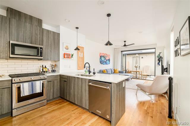 An artful expression of modern living is available for lease in this newer construction Sloan’s Lake townhome, where sunlit interiors and effortless indoor-outdoor connection define a rare urban retreat. Just one block from the lake and moments from vibrant dining and entertainment, this 2023 residence offers three levels of refined design and exceptional livability. A picture window frames the dining area, leading into an open kitchen with sleek cabinetry and a peninsula with seating. The living area expands through a multi-panel glass door to a private backyard with a patio, perfect for quiet mornings or lively hosting. Upstairs, the generous primary suite boasts a walk-in closet, complemented by two additional bedrooms. The third level features a flexible lounge area with a wet bar and access to a rooftop deck capturing picturesque mountain and city skyline views. Complete with a detached one-car garage, this pristine home embodies the best of contemporary Sloan’s Lake living. SHORTER LEASES WILL BE CONSIDERED ON A CASE BY CASE BASIS. Application Link: Townhouse MLS# 3654453