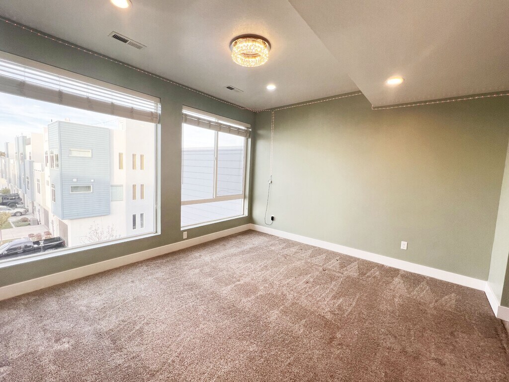 2021 built, rare found modern, privacy and peaceful home in the center of Salt Lake County 360-degree unblocked view, mountains, valleys and the Great Salt Lake Biggest suit in the masterfully-planned gated community. 2975 Sqft, 4beds (potential 5 beds), 2.5baths 465 Sqft roof deck Fenced backyard Row-end, plenty of natural light 5 levels for various functions - kitchen and family room in the 2nd floor (795 SF); 3 beds in the 3rd floor (990sf), office or 4th bed in the main floor(375 SF) , 2nd family room or 5th bed at the finished basement (350SF); 465 sqft roof deck for BBQ and the sun; Beautiful fenced backyard with lawn for kids and dog play. 2 garages+ 2 more parking space Stainless appliances. Refrigerator, Microwave, Dishwasher included Upgrades galore quartz through out 5 mins to Costco, shopping center, Megaplex theatres , SLCC and public transportation 15 mins to international airport, intermountain hospital, University of Utah 40 mins to Brighton, Alta, Solitude ski resort No smoking Landlord paid HOA includes: high speed fiber internet, sewer, water, garbage and snow removal Tenant pay: $3095 security deposit, $2795 refundable $3095 monthly rent Pets allowed, $50/each $40 non-refundable application fee for each adult $300 Initial fee. Tenant pay all utilities - gas, power and internet Equity Real Estate is committed to equal housing opportunity. The tenant is advised to request a Rental Price Disclosure or Good Faith Estimate to review all charges associated with the lease. Guo :