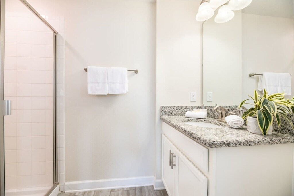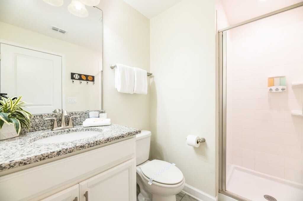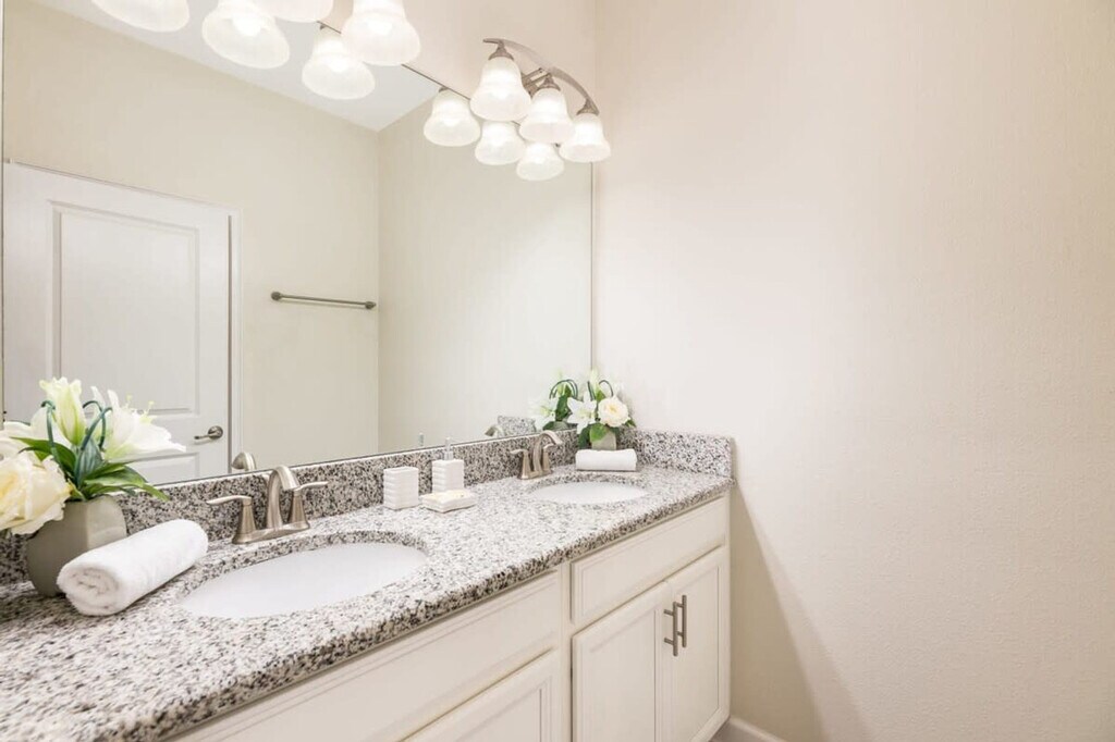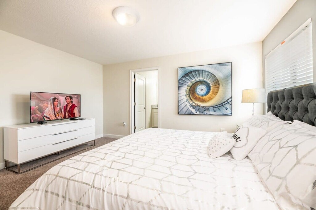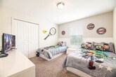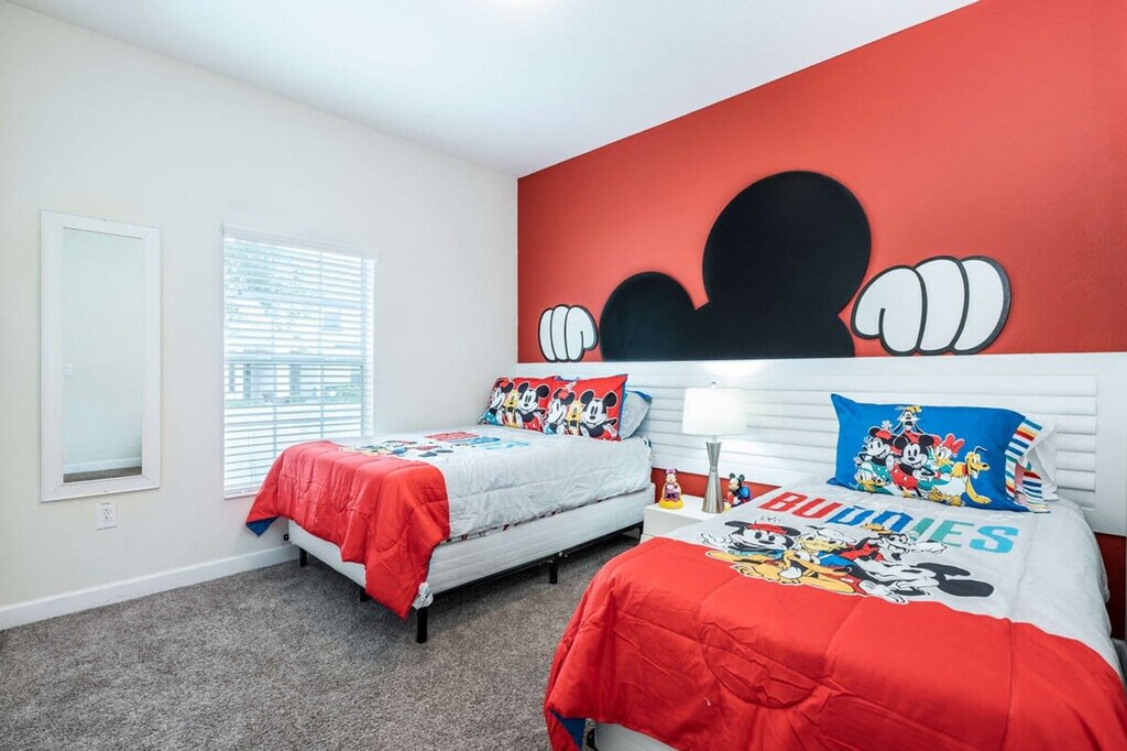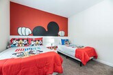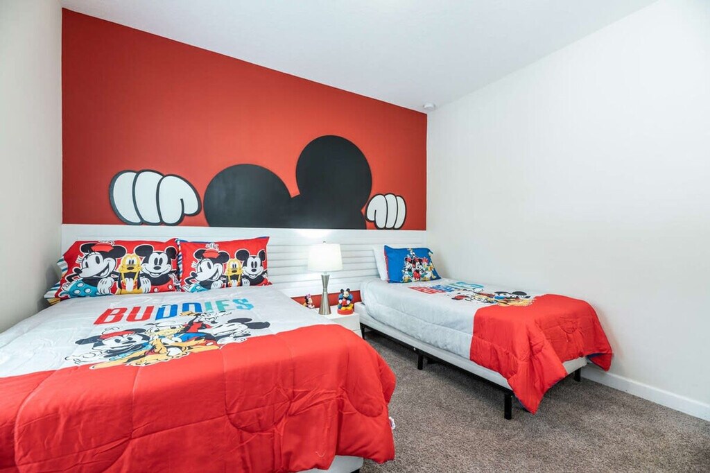 Welcome to this newly renovated 5-bedroom, 4-bathroom townhome, designed to accommodate 12 guests comfortably. Dive into relaxation in the private pool and indulge in the luxurious amenities of Champions Gate resort, including a full clubhouse, two pools, a lazy river, tennis courts, and a fitness center. Nearby markets, restaurants, and shops ensure convenience at your fingertips. Experience the magic of Mickey's bedroom and much more in your ideal vacation home! Step into this meticulously designed 5-bedroom, 4-bathroom townhome, where comfort and charm intertwine seamlessly. The spacious living room effortlessly connects with the dining area and a fully equipped kitchen, forming a central hub for relaxation and culinary delights. Outside, the private heated pool on the patio invites you to unwind, offering moments of serene leisure. On the first floor, you'll find a queen bedroom and a Mickey-themed bedroom with a double and a single bed, both sharing a bathroom. Upstairs, the master king bed suite, another king bedroom with an en-suite bathroom, and the fifth bedroom featuring a double and a single bed, each come with their own bathroom. For added convenience, a laundry room equipped with a washer and dryer awaits your use. Enjoy complimentary Wi-Fi and take advantage of free parking during your stay. To ensure a smooth beginning to your vacation, a thoughtful welcome kit containing essential bathroom and kitchen amenities is provided. Embrace a delightful escape where comfort and style effortlessly merge – a place where cherished memories are created. Your perfect vacation haven is here, waiting to welcome you. Replenishment of bathroom and kitchen amenities is the guest's responsibility. Heating the pool is a paid service and there is also a fee charged to use the barbecue grill. Champions Gate Resort is a resort-style community that offers every imaginable amenity for a blissful stay. It features an impressive clubhouse with a variety of courts and outdoor activities like tennis, beach volleyball, and a golf course, while its restaurant and fitness center will help you stay refreshed and fit. Its swimming pool complex is perfect for a splashy day, with slides, a lazy river, and a kids splash pool. Plus, the resort is just 20 minutes away from Disney Parks, ensuring plenty of opportunities for fun and adventure. Shopping, dining, and entertainment are also within reach, with stores, restaurants, and supermarkets nearby. It's the perfect place for a family getaway; come and experience all the perks of Champions Gate Resort! Quiet hours are between 22:00 and 8:00. [SI]