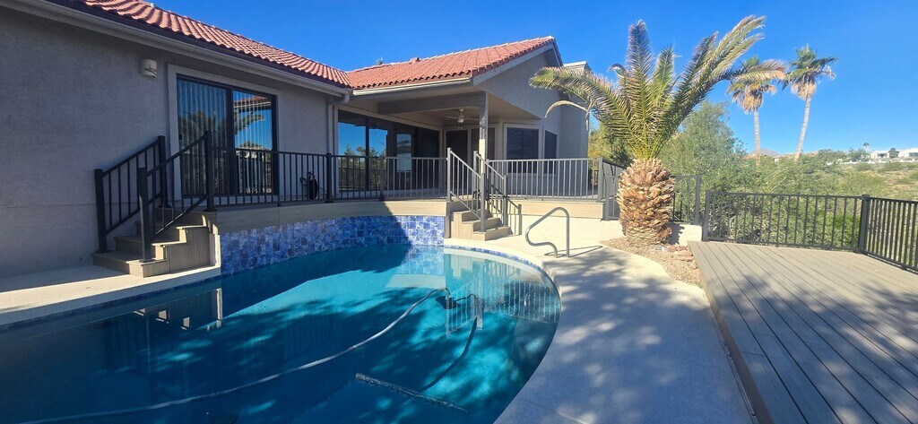 Single family home with FANTASTIC views of Fountain & mountains from pool and deck that backs to wash area. Pool and deck was recently remodeled. There are 2 bedrooms with 2 full baths. Has fireplace in family room off kitchen. Includes ALL appliances. Separate living room with great views out large patio windows. Attached 2 car garage. Tile and wood flooring. DO NOT APPLY PRIOR TO TALKING TO PAM NABERS AT OFFICE PROPERTY