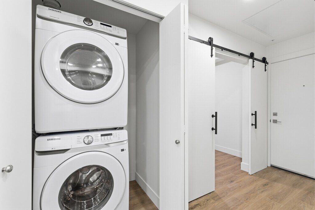 Now Available for Rent. Welcome to Fraser Monse. Modern 2-bedroom home located on the fifth floor, featuring a bright and spacious layout with high ceilings, a full kitchen complete with sleek, soft-closing cabinetry and equipped with premium Samsung appliances. This well-designed unit offers comfortable living with air conditioning already installed, along with a private patio space to enjoy. Residents benefit from in-suite laundry and access to exceptional building amenities including rooftop terrace, courtyard BBQ areas, and a resident lounge with a children's play area. The unit includes 1 secure underground parking stall and 1 storage locker. Ideally situated in the heart of Fleetwood, just steps to Fresh Street Market, restaurants, medical clinics, parks, schools, and bike trails, and only a short walk to transit and the future SkyTrain station. One Year Lease. Screening Required. Utilities Separate. Property Listed by Four Seasons Property Management Ltd.