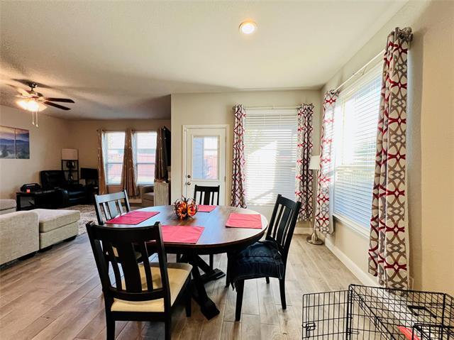 Well-maintained 4-bed, 2-bath home in Northwest ISD. The open-concept living room flows seamlessly into the kitchen, which includes a gas range, built-in microwave, stainless steel appliances, abundant storage, and a refrigerator that stays with the home. A small office sits just off the living room—perfect for working from home or additional flex space. Split bedrooms with walk-in closets. The spacious primary suite offers an oversized walk-in shower and generous closet space. The laundry room provides plenty of space for a freezer or extra storage. Out back, enjoy a covered patio and a fenced yard ideal for relaxing or entertaining. Located in a community with fantastic amenities, including a park, pool, pond, and walking paths. Only two small dogs under 40lbs allowed with owner approval. No cats please. 12 month lease term only. In addition to monthly rent, $75.00 monthly lawn maintenance fee required through February 1, 2026. Beginning March 1, 2026, tenant is responsible for acquiring or maintaining their own landscaping - lawn maintenance.