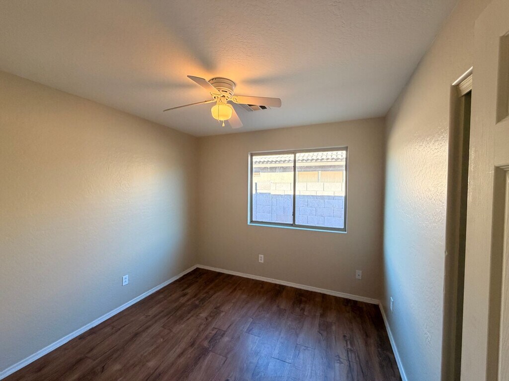 Home is located on a cul-de-sac for extra privacy! Warm custom tan paint throughout! Open concept main living area with vaulted ceilings and awesome natural light. Kitchen offers all black appliances & large breakfast bar. Den has warm wood planking and decorative arches. The primary suite features blinds, wood plank flooring, private bath with dual sinks, separate toilet room as well as a walk in closet. Two guest bedrooms with side-by-side closets also have warm wood planking and share a guest bath. Full laundry room with washer and dryer hook ups. Covered patio for entertaining and easy to maintain desert landscaping in the back. Minutes from I-10 and 303 for commuting, close to schools and parks. Home is friendly to a max of two spayed/neutered pets with a $450 deposit per pet. We do not list on CRAIGSLIST of FACEBOOK MARKETPLACE SO IF YOU SEE IT ON THERE IT IS A SCAM $50.00 non-refundable application fee per adult, age 18 or over. Base rent does not include monthly 3% admin fee. Full security deposit of $1,695 is due upon approval. Move in date must be between 7 & 30 days from lease signing/payment of security deposit. If moving in on or after the 5th then pro-rated current month rent is due as well as the following full month. All rent is due 7 days prior to move in.